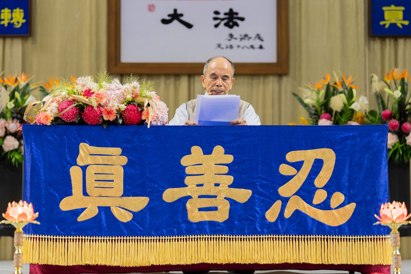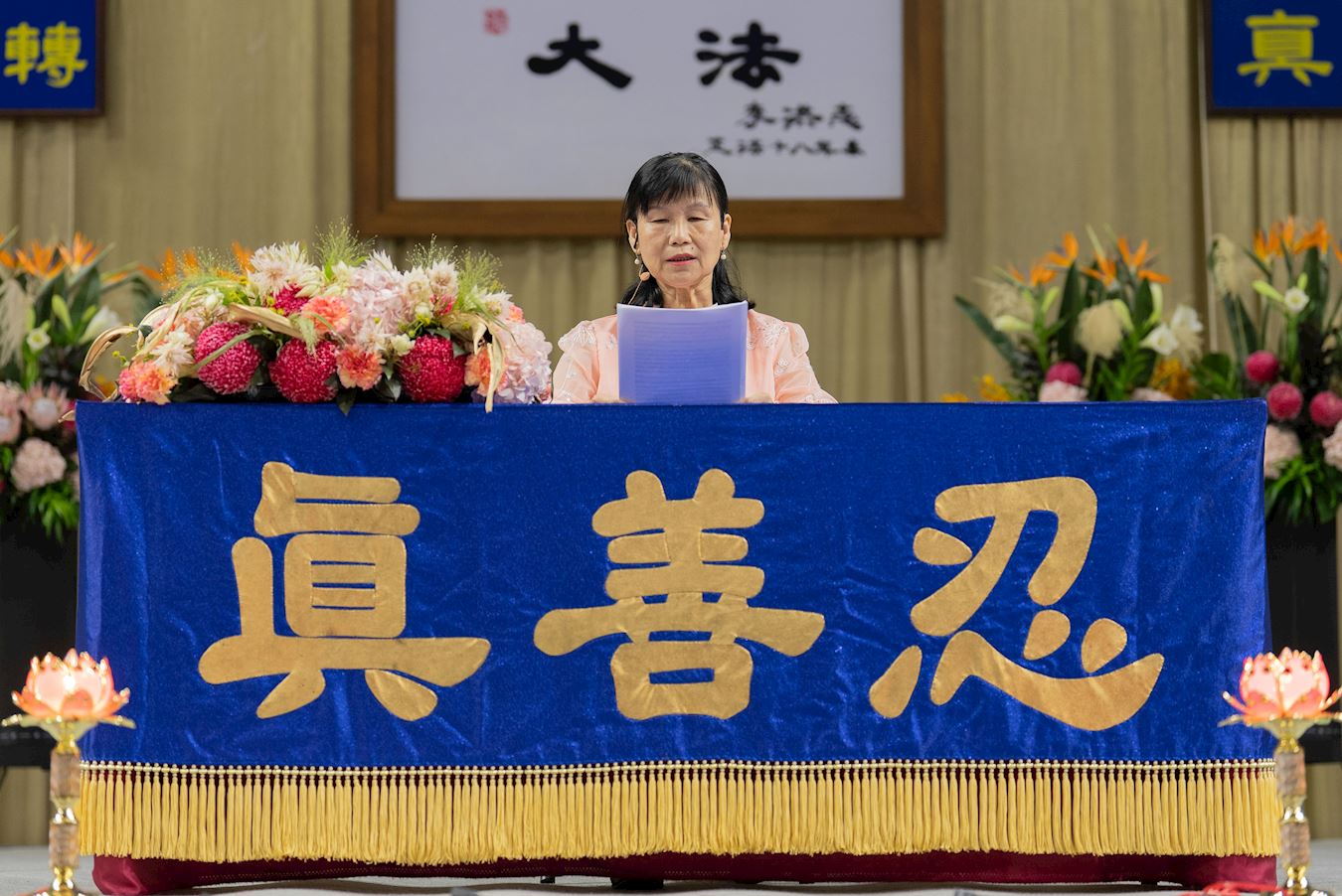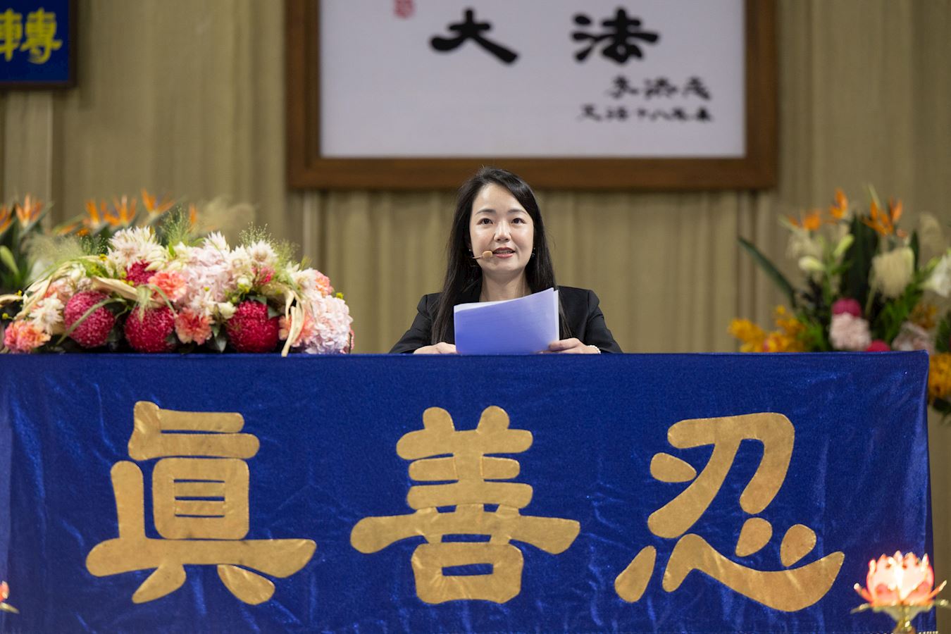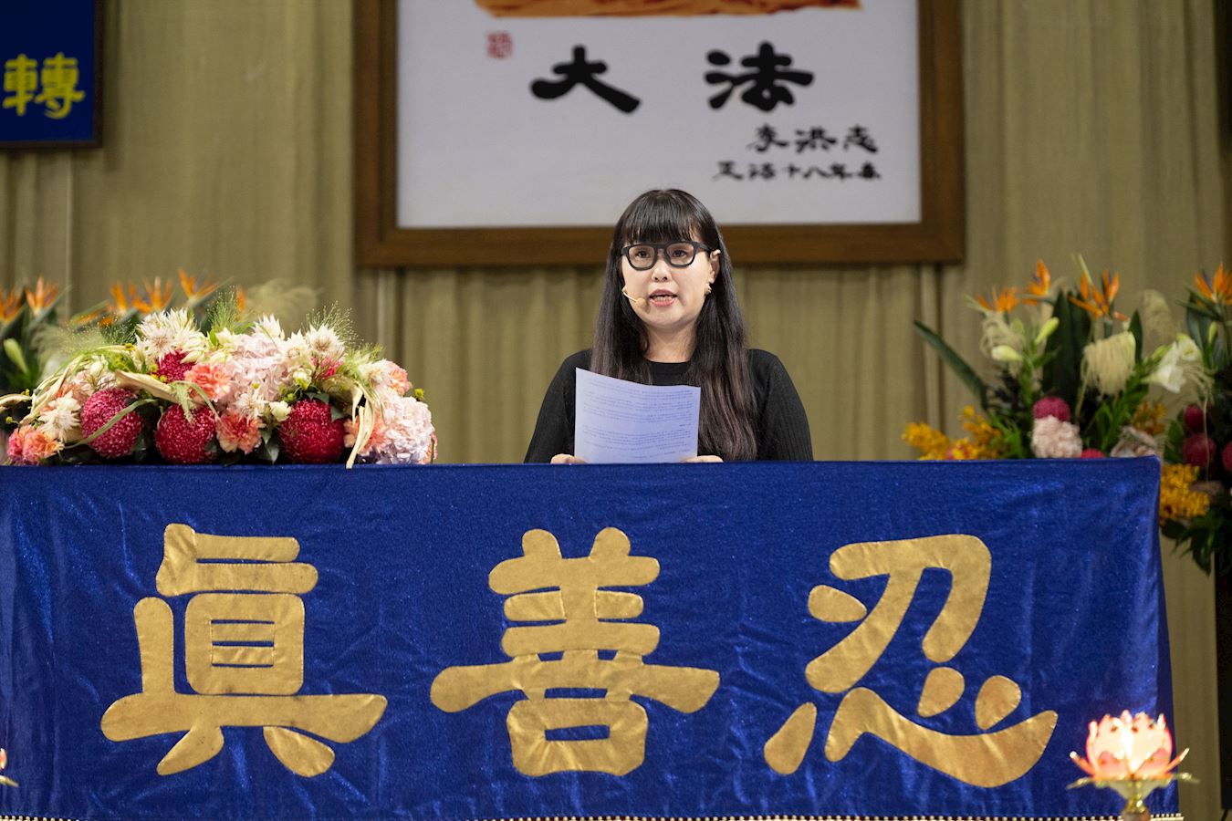 法会会场庄严殊胜,主席台正中央悬挂着法轮功创始人李洪志师尊的法像,两边是《洪吟二》〈法正乾坤〉的诗句:“慈悲能溶天地春 正念可救世中人”。面对主席台的后方挂有“正念正行”的巨型横幅,勉励学员精進不懈。