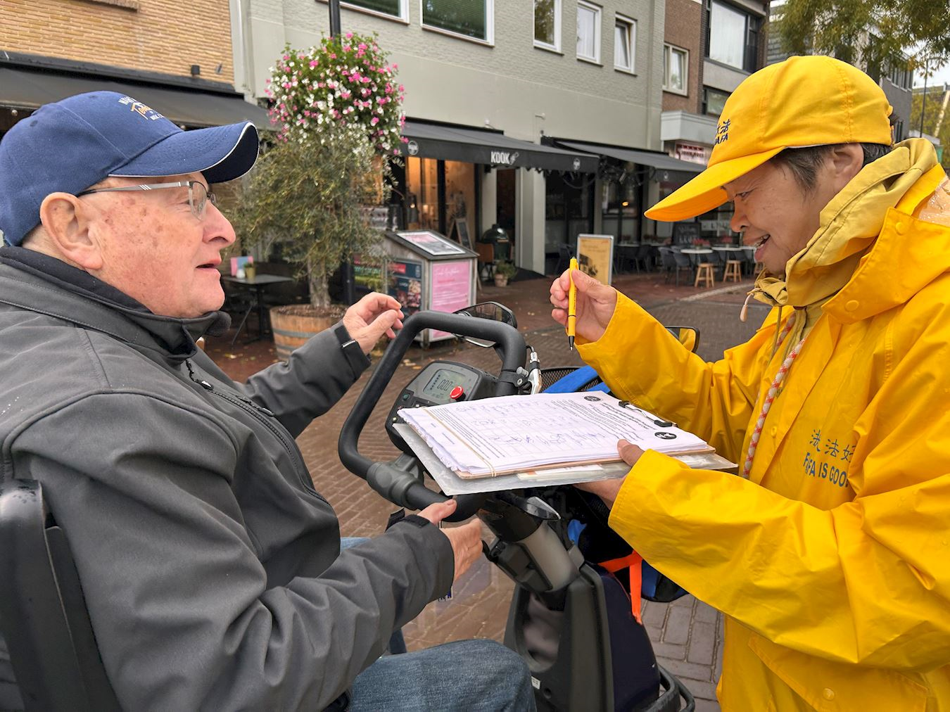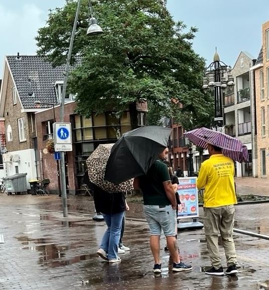 【明慧网二零二五年十月二十八日】二零二五年九月二十日及十月二十五日,荷兰巡回真相点到埃德(Ede)和奥斯(OSS)市传播大法真相,揭露中共对法轮功长达二十六年的迫害。虽然两次的活动都在雨天,学员们坚持摆出真相展位,让很多人驻足有机会了解法轮功。