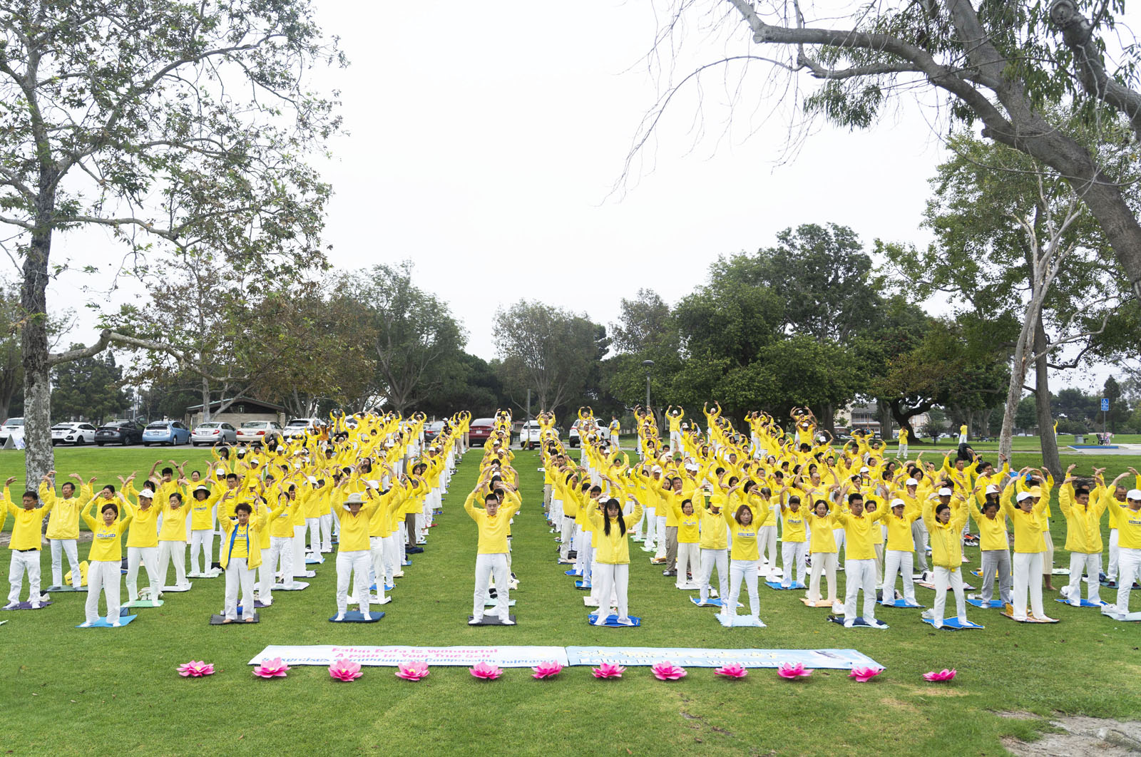图1:二零二五年九月二十一日,大洛杉矶地区部份法轮功学员聚集在橙县芳泉谷市的英里广场区域公园,恭祝法轮功创始人李洪志大师中秋节快乐。