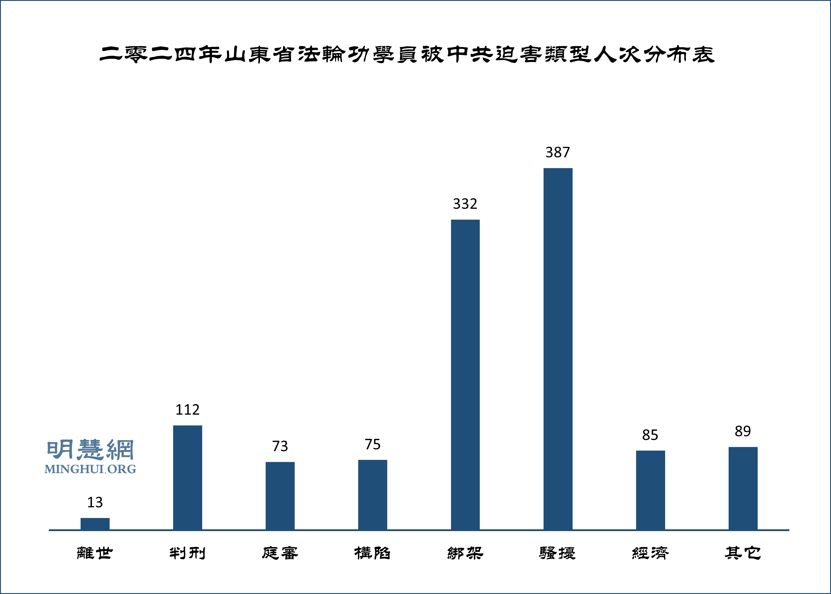 据明慧网数据统计,二零二四年山东省法轮功学员被中共用各种手段迫害总计1166人次,其中,112人被非法判刑,332人被绑架……