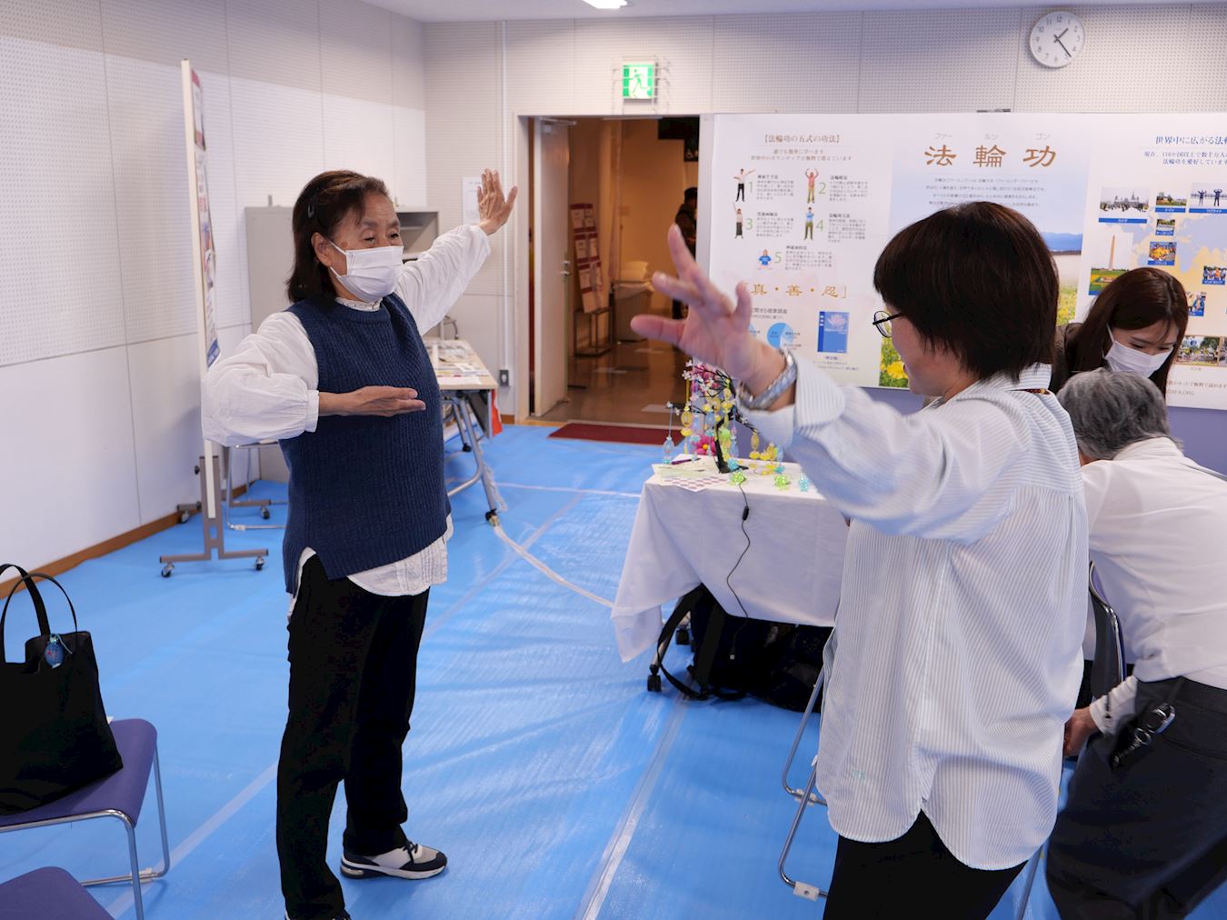 '图6:国富女士(右,穿黑色上衣者)与学员交谈中询问了横滨市内炼功点的信息。'