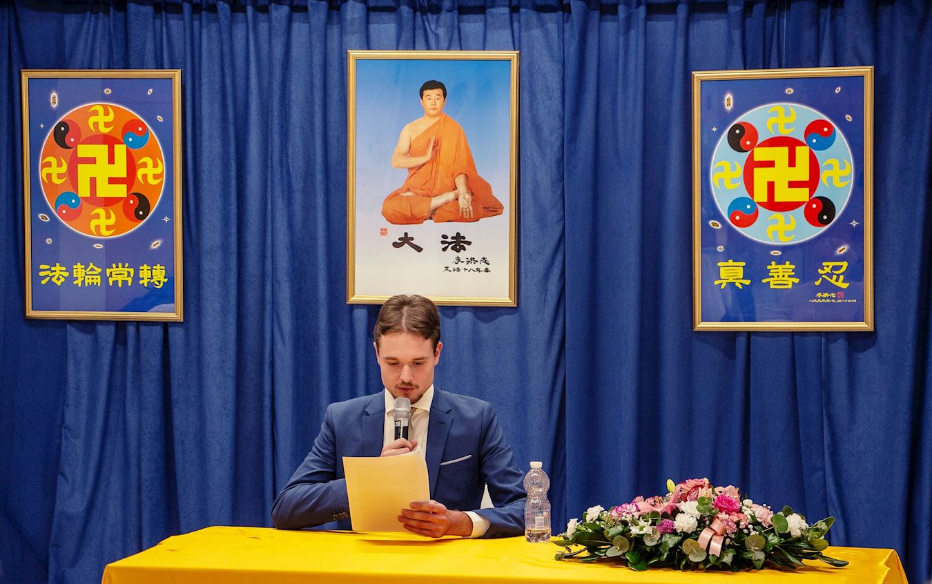 '图3~7:法轮功学员在法会上发言,分享自己的修炼体会'