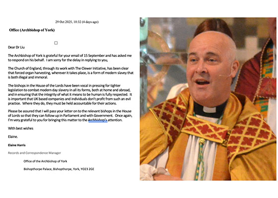 十月二十九日,英国国教会约克大主教办公室伊莱恩·哈里斯女士,代表大主教斯蒂芬·科特雷尔致信英国法轮大法学会。