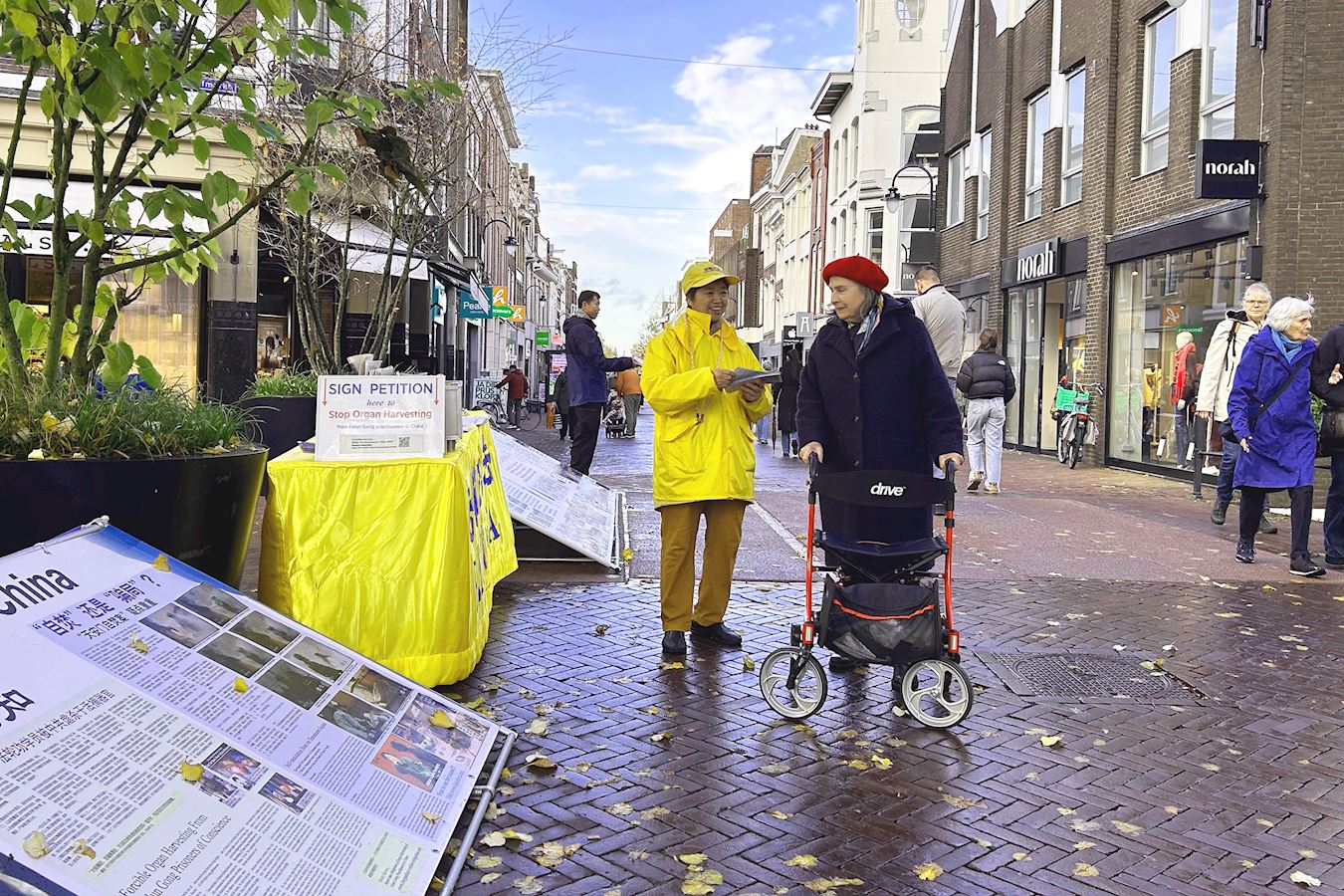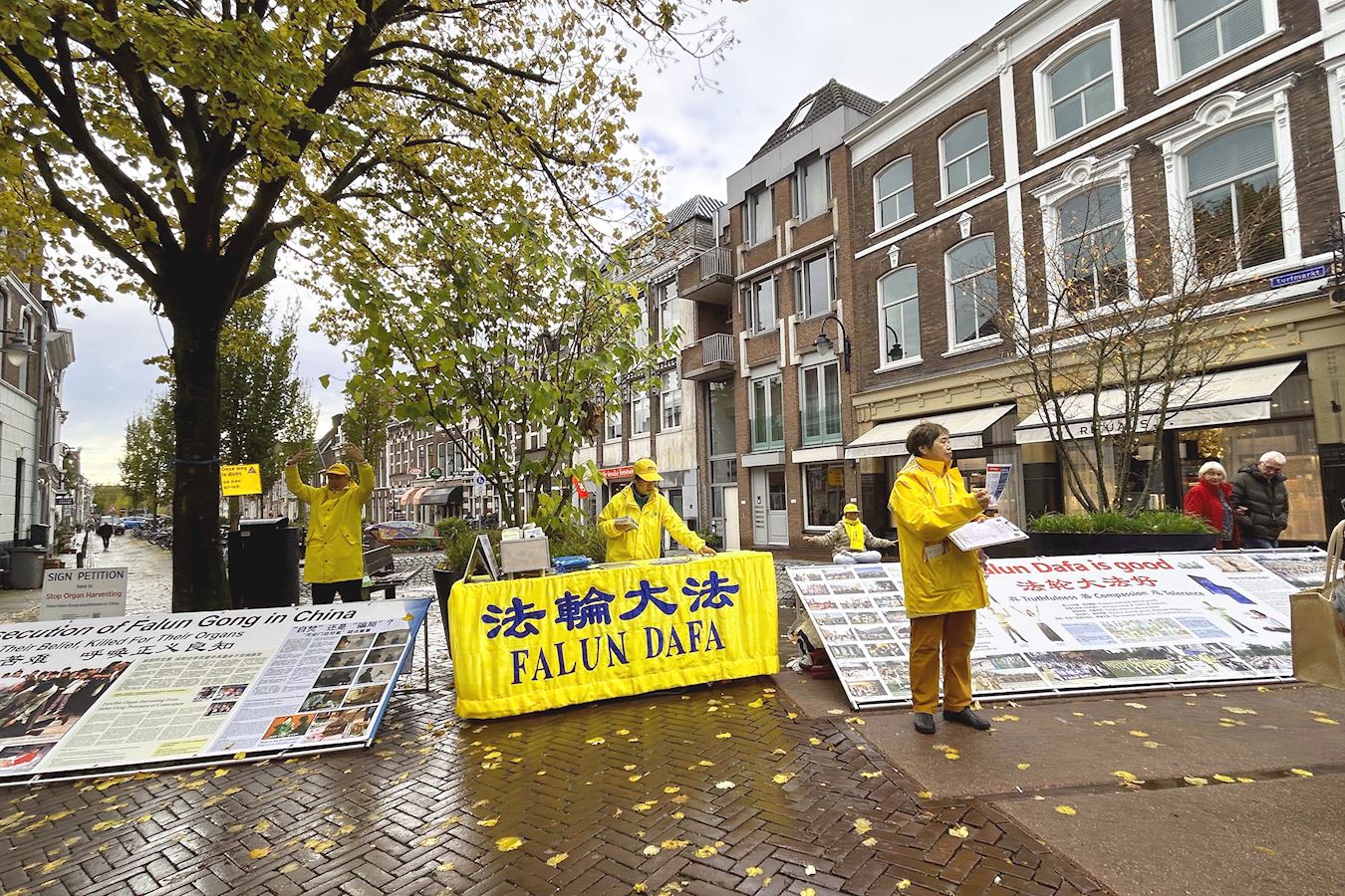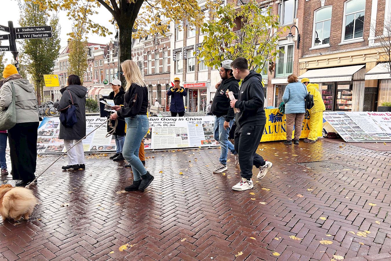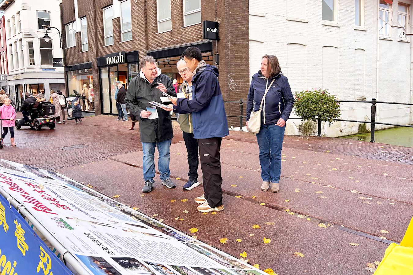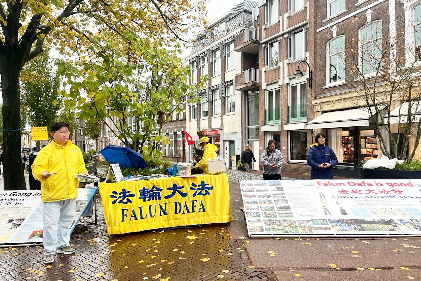 【明慧网二零二五年十一月五日】二零二五年十一月一日,荷兰法轮功巡回真相点来到荷兰西部的城市豪达(Gouda),举办信息日活动。法轮功学员在市中心草坪市场(Turfmarkt)设置真相展板,展示法轮功功法。一些学员与路人交谈,发放传单,讲述中共迫害法轮功的真相。有不少游客了解了法轮功真相並簽名支持反迫害。