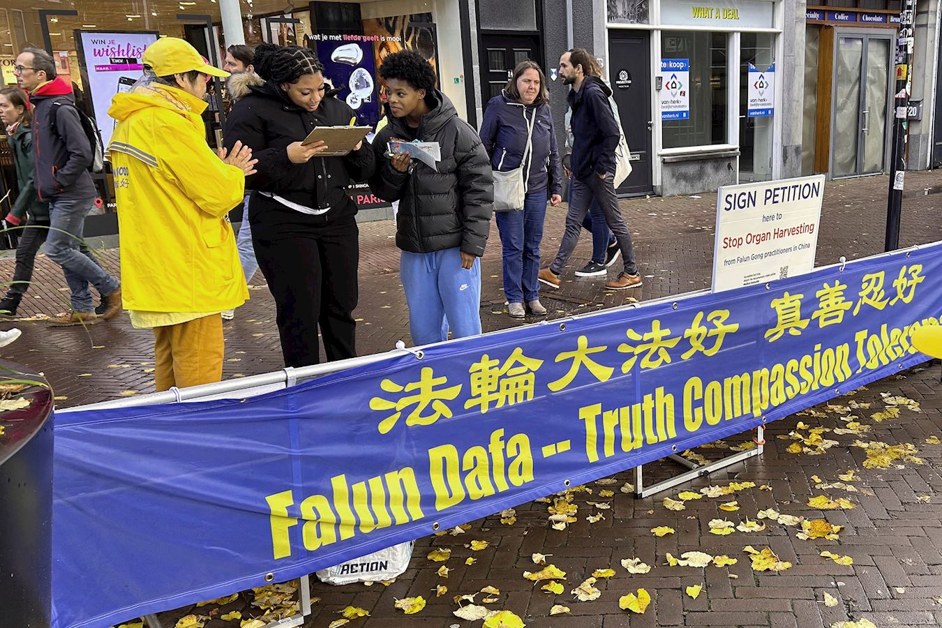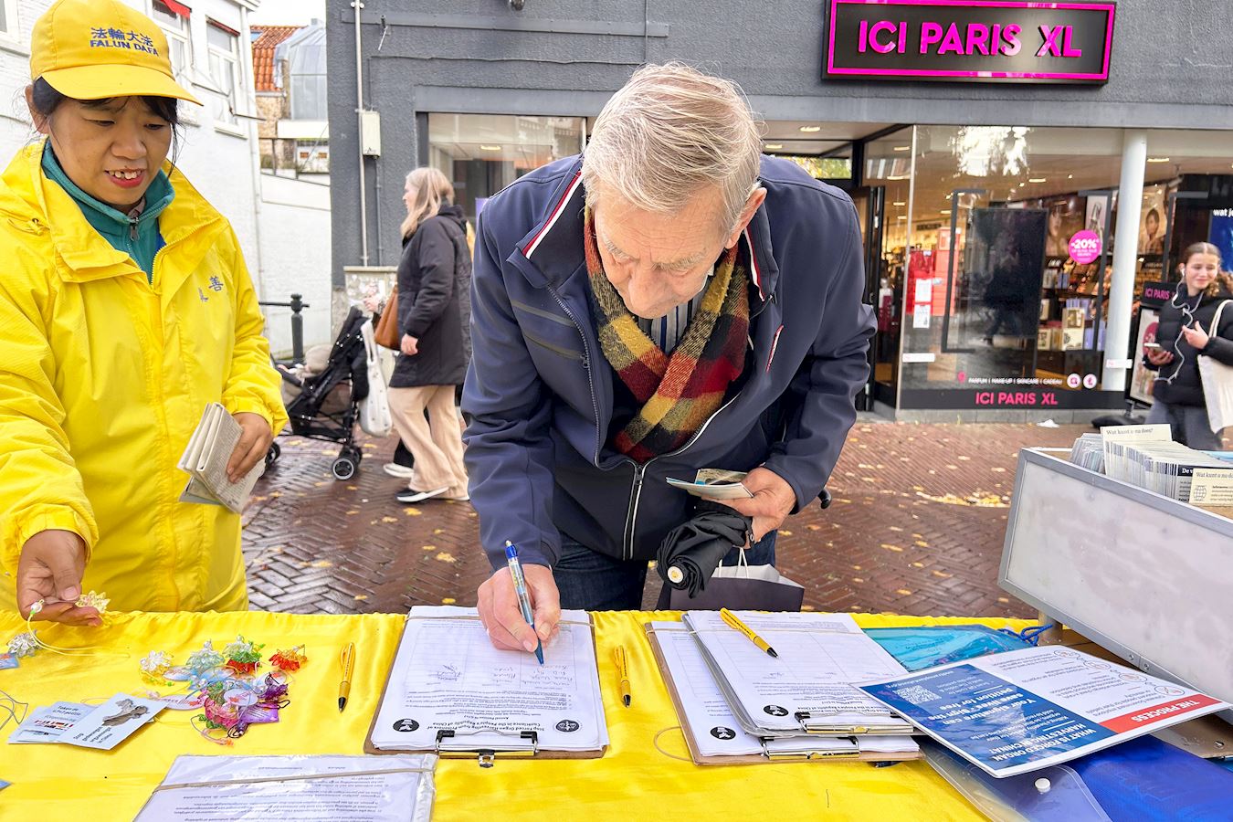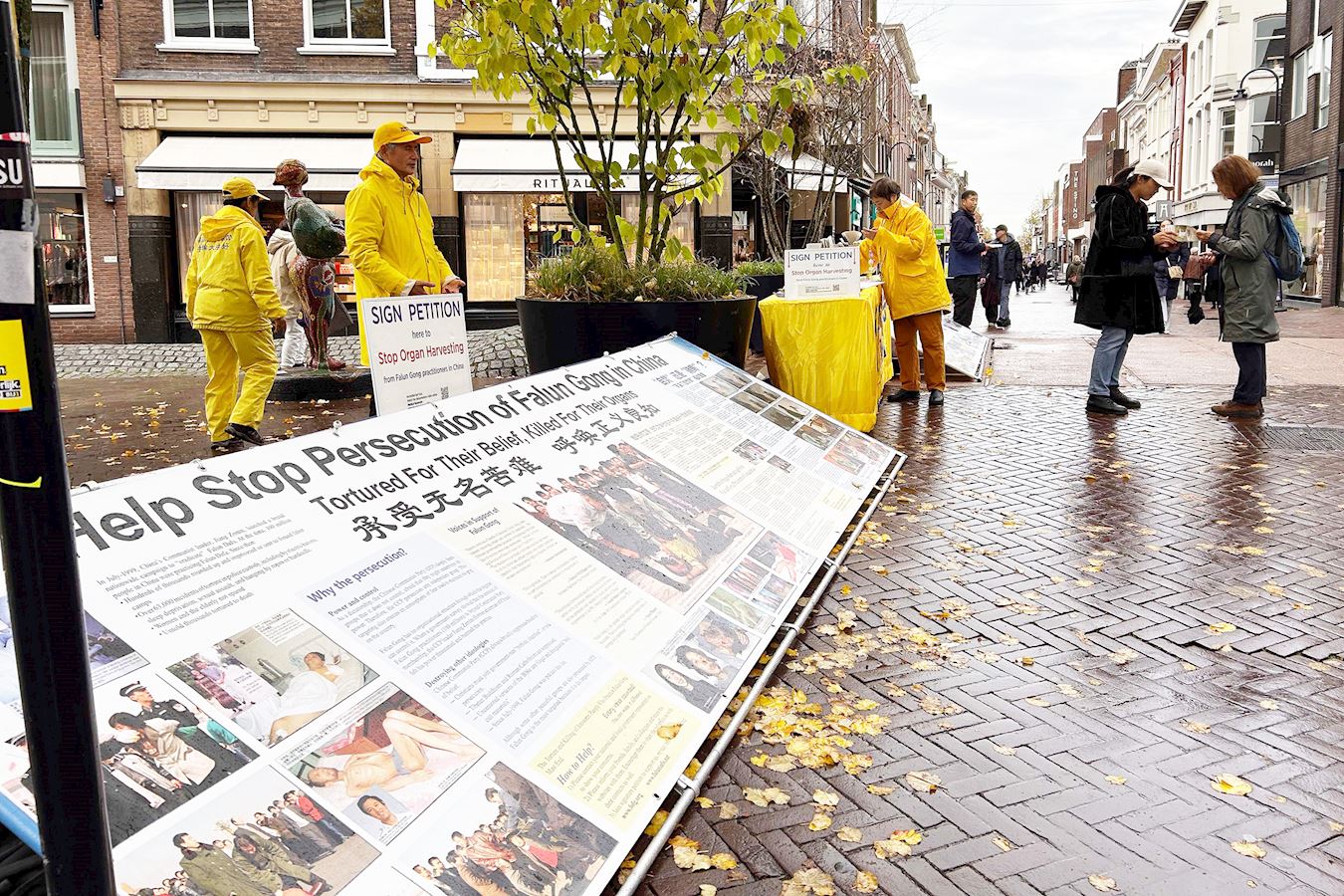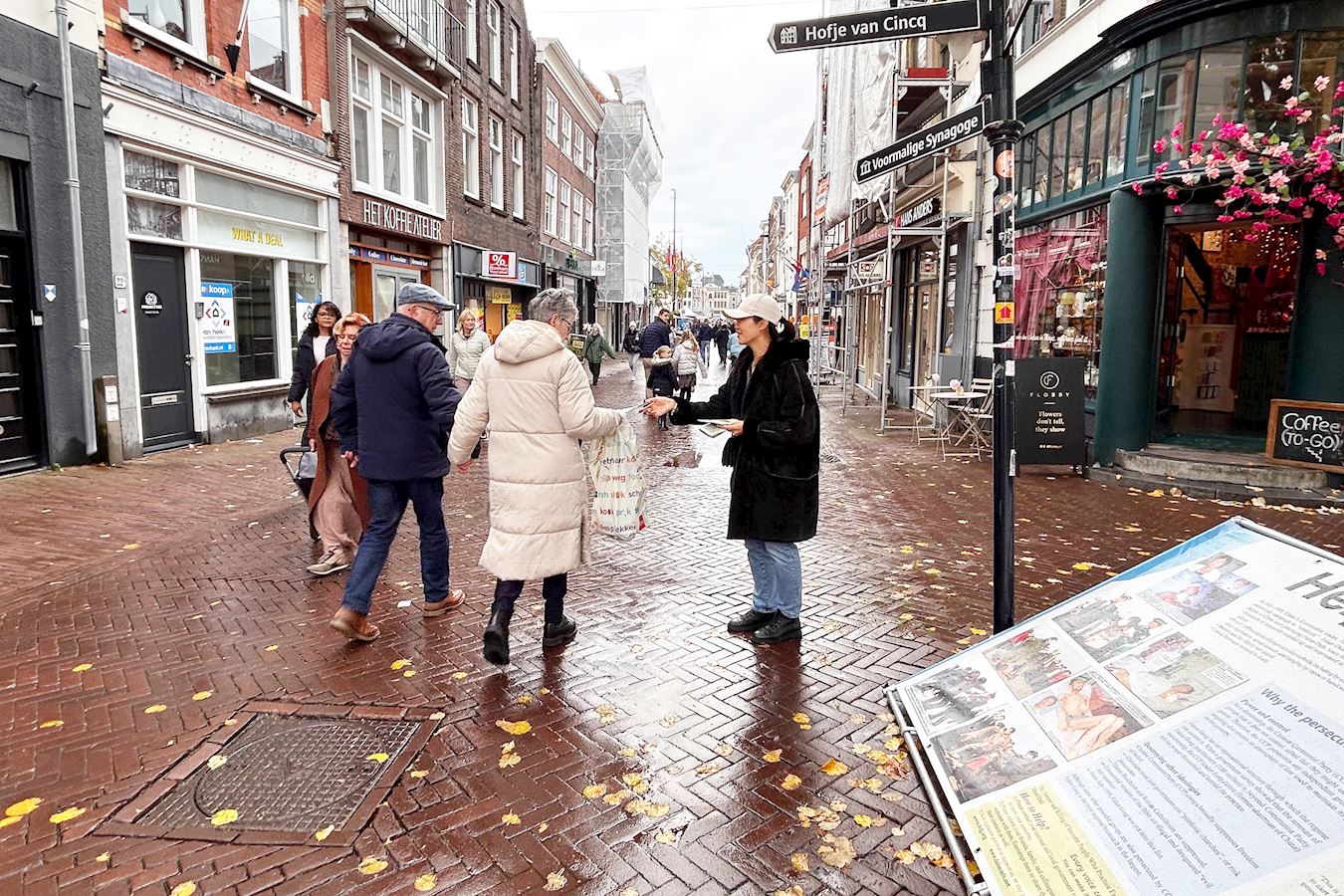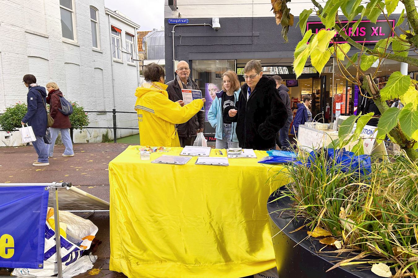 【明慧网二零二五年十一月五日】二零二五年十一月一日,荷兰法轮功巡回真相点来到荷兰西部的城市豪达(Gouda),举办信息日活动。法轮功学员在市中心草坪市场(Turfmarkt)设置真相展板,展示法轮功功法。一些学员与路人交谈,发放传单,讲述中共迫害法轮功的真相。有不少游客了解了法轮功真相並簽名支持反迫害。