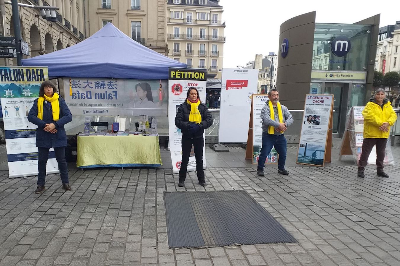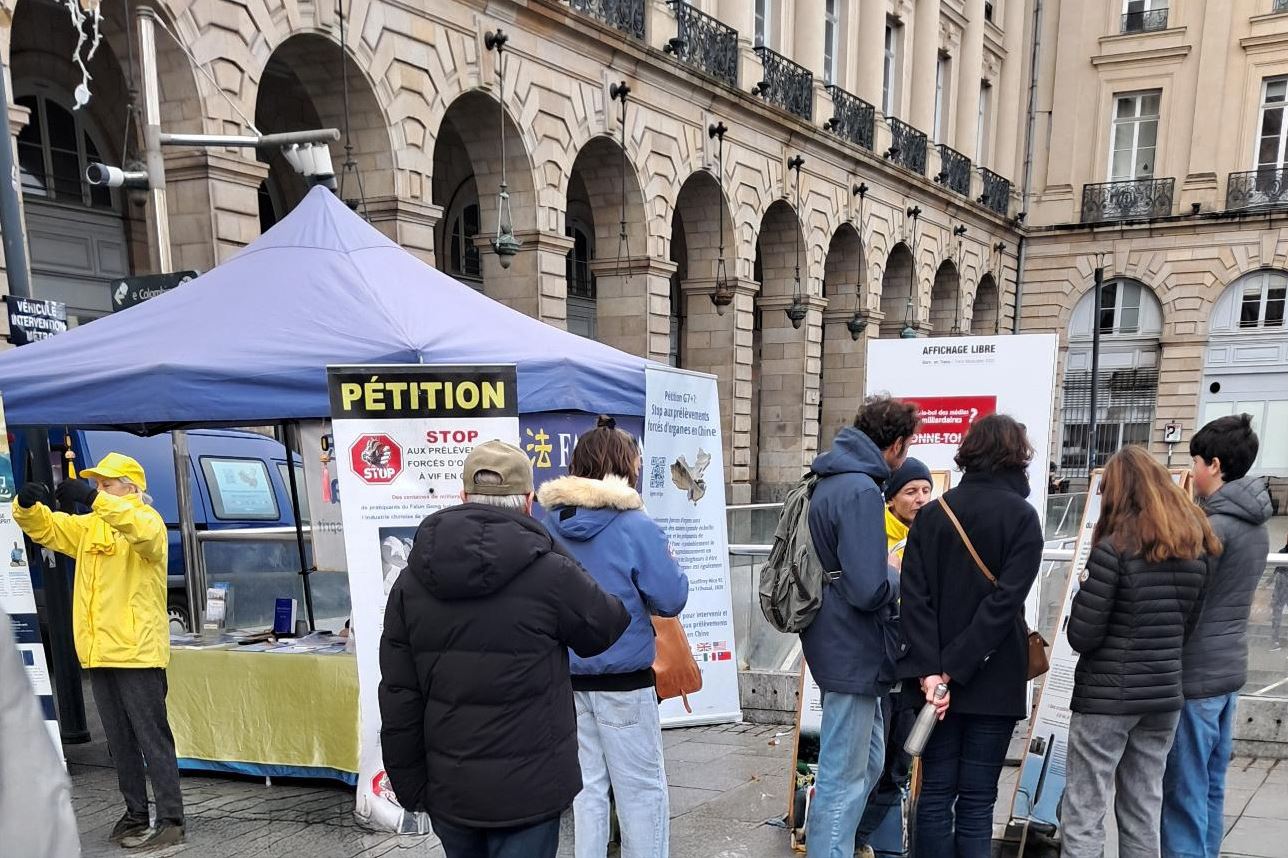 二零二五年十二月六日,法轮功学员在法国西部布列塔尼首府雷恩市(Rennes)的共和国广场举办了法轮功信息日活动,吸引了许多人驻足拍照,还有人拍摄了真相展板。