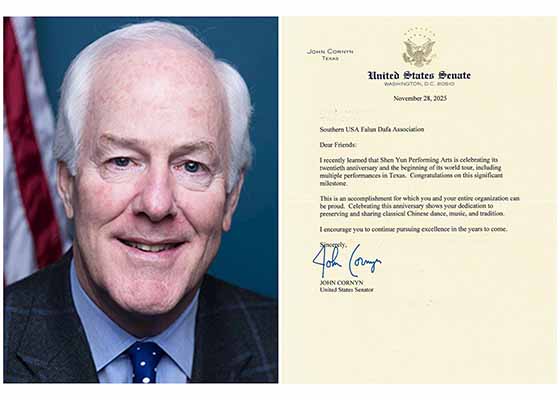 十一月二十八日,美国德克萨斯州联邦参议员约翰‧科宁致信美南法轮大法佛学会,祝贺神韵艺术团成立二十周年,并赞扬神韵传承与分享中国古典舞、音乐及传统文化的奉献精神。