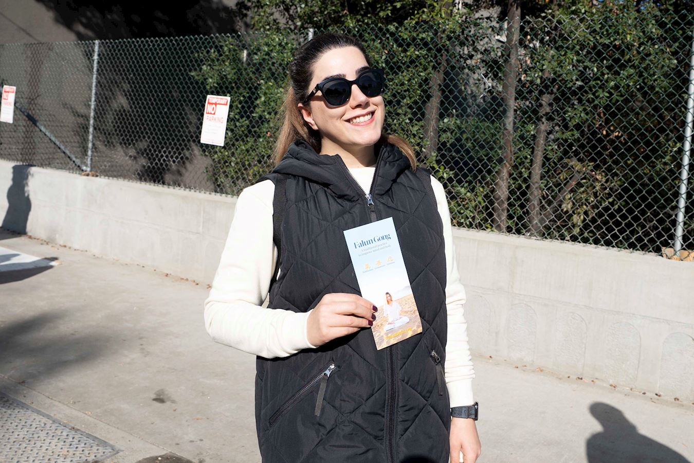 皮雅注意到了天国乐团队首的“法轮大法”横幅。听了学员介绍:法轮大法是基于真、善、忍原则的修炼方法,每个年龄层的人都可以从法轮大法的修炼中受益,这就是为什么乐团里可以看到不同年龄的人。皮雅说:“我们很需要善良和真诚,尤其在现在的社会环境下。”她认为人们需要更多地考虑他人,并表示会前往法轮大法网站了解更多。