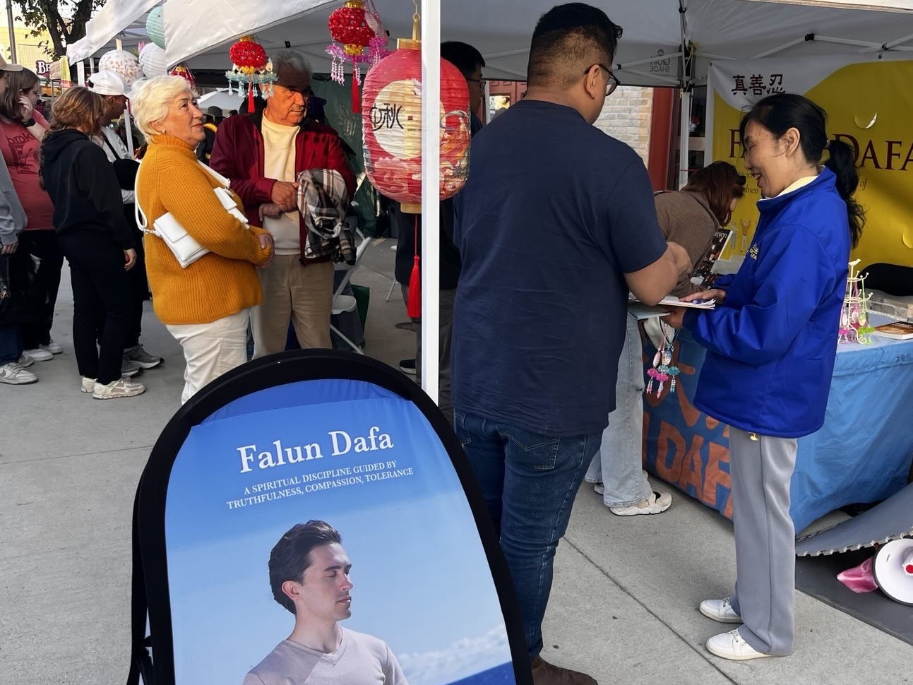 在两天的活动中,很多来自中国大陆的华人在展位驻足,和学员们交谈,其中不少华人主动要不同类型的中文真相资料,还有人现场表示要做三退。