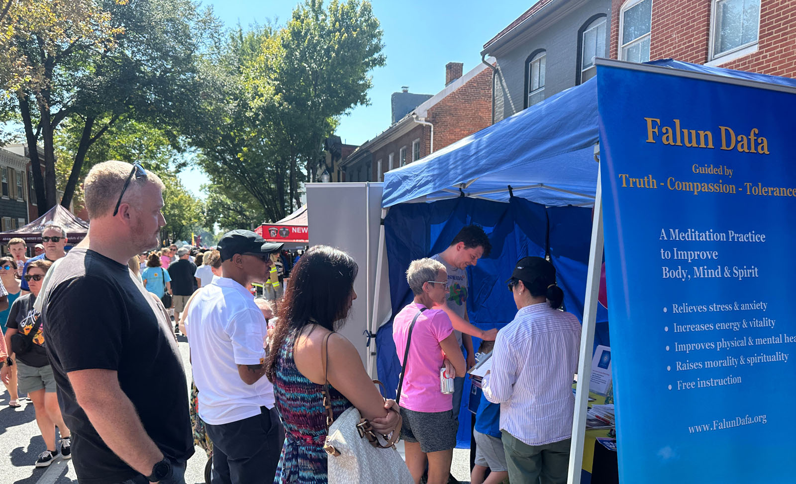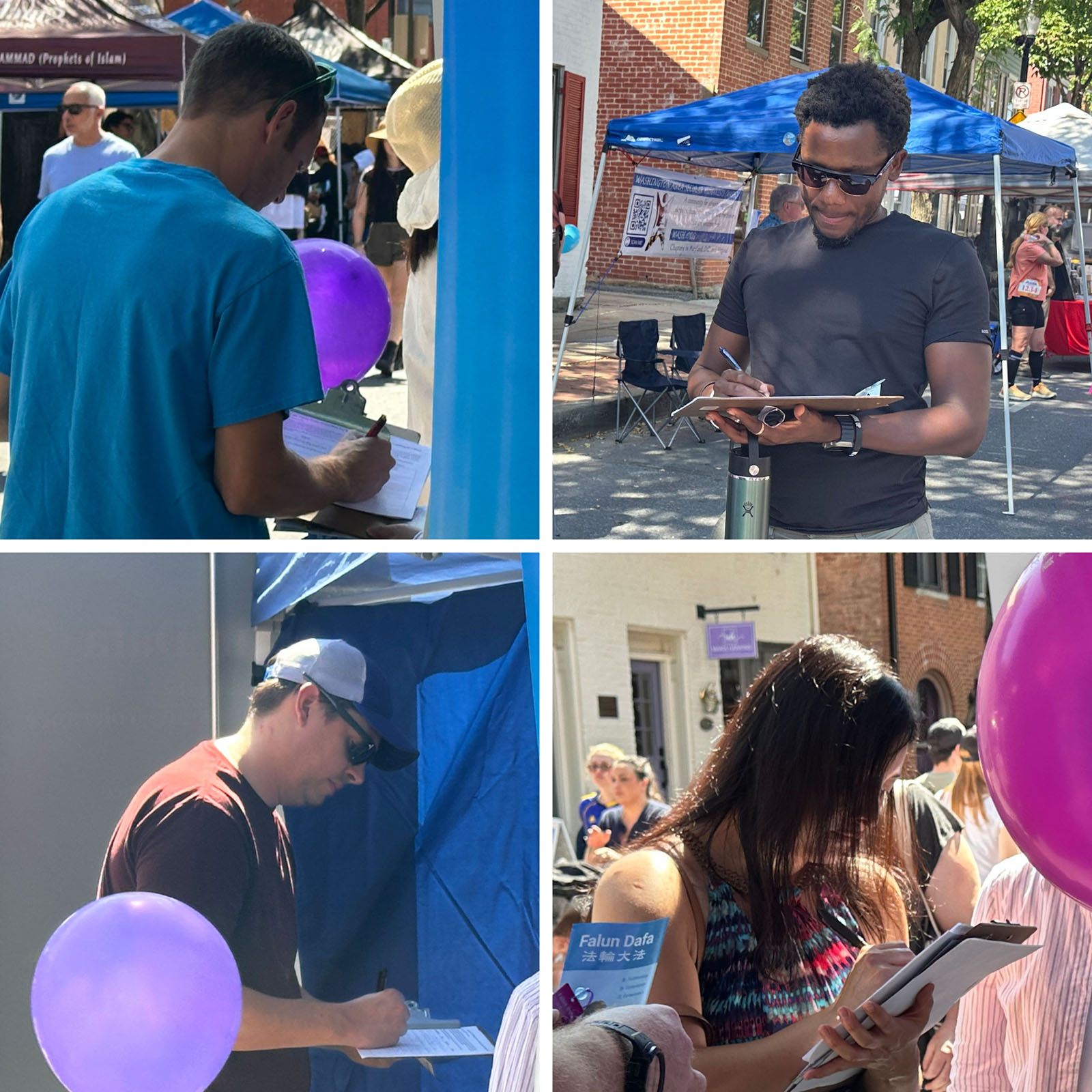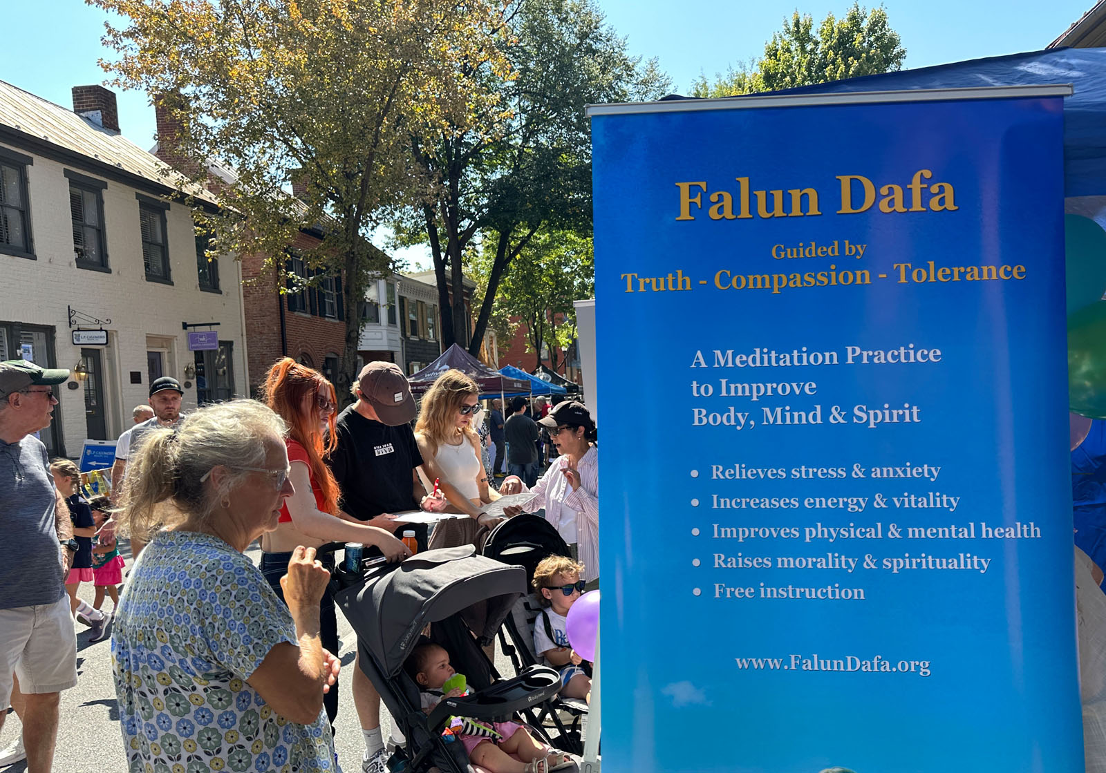二零零五年九月十三日举办的“街头节庆”活动上,马里兰州的法轮功学员向民众介绍法轮大法,并让人们了解中共迫害法轮功的真相。有些人说,他们正在找寻可以缓解压力的打坐功法,他们想学炼法轮功。还有些人了解真相后,在呼吁制止中共迫害法轮功的征签表上签名。