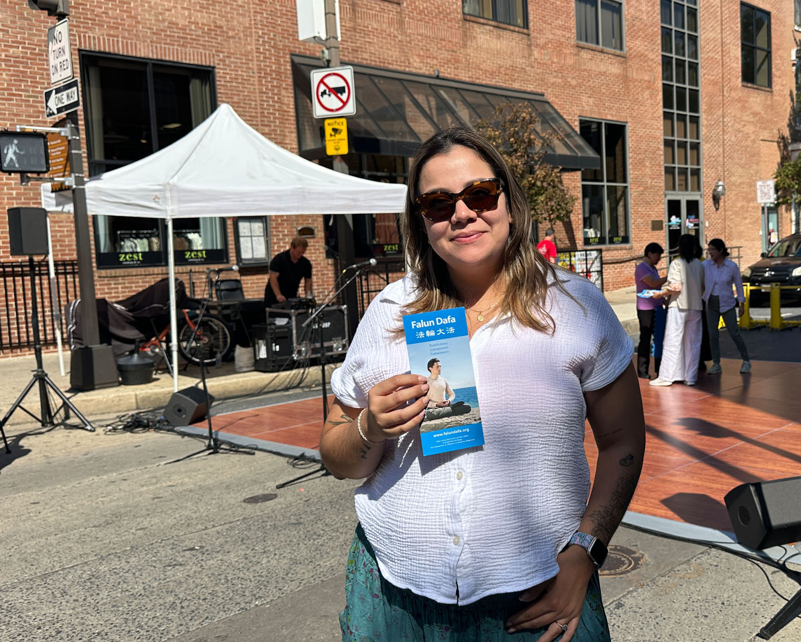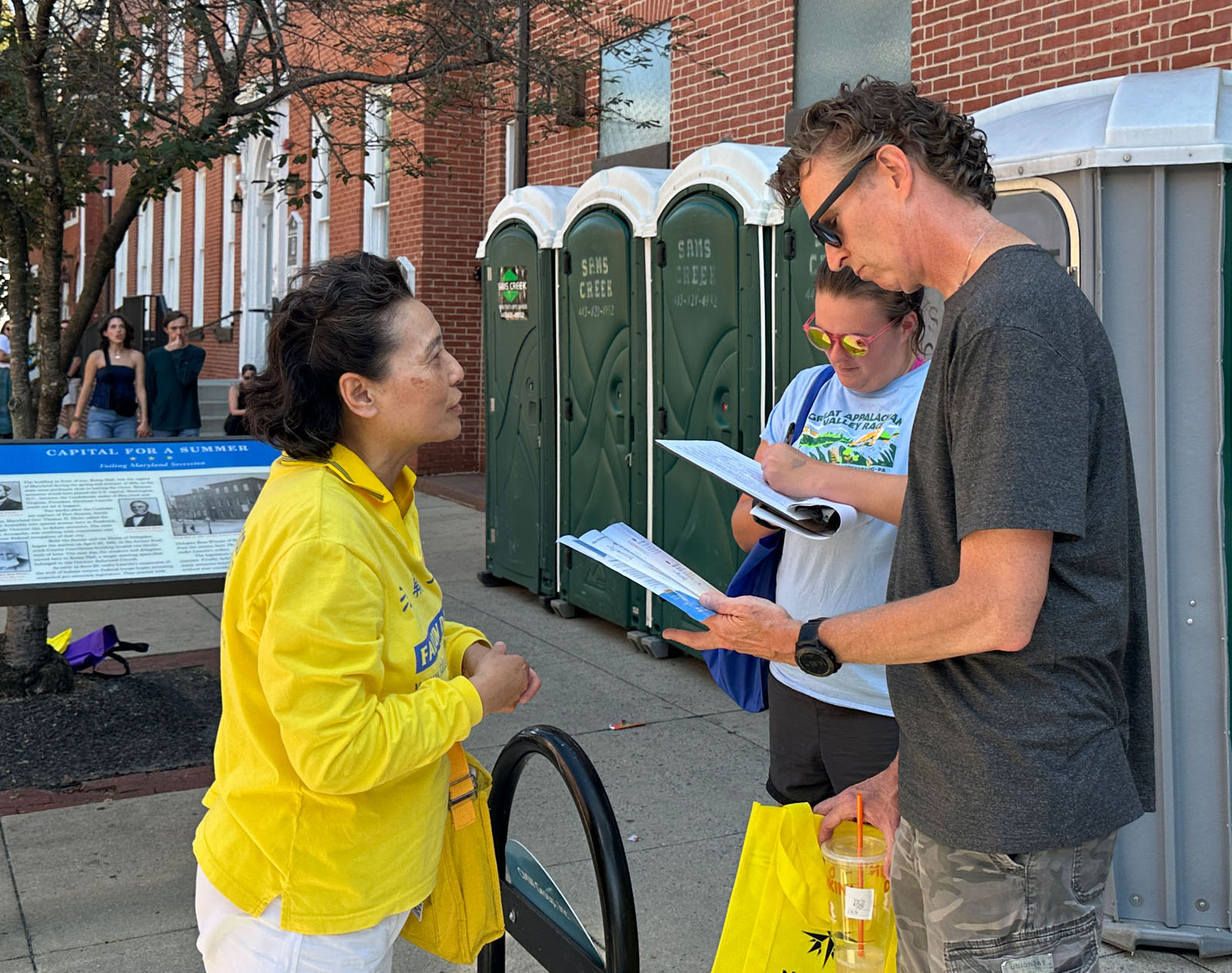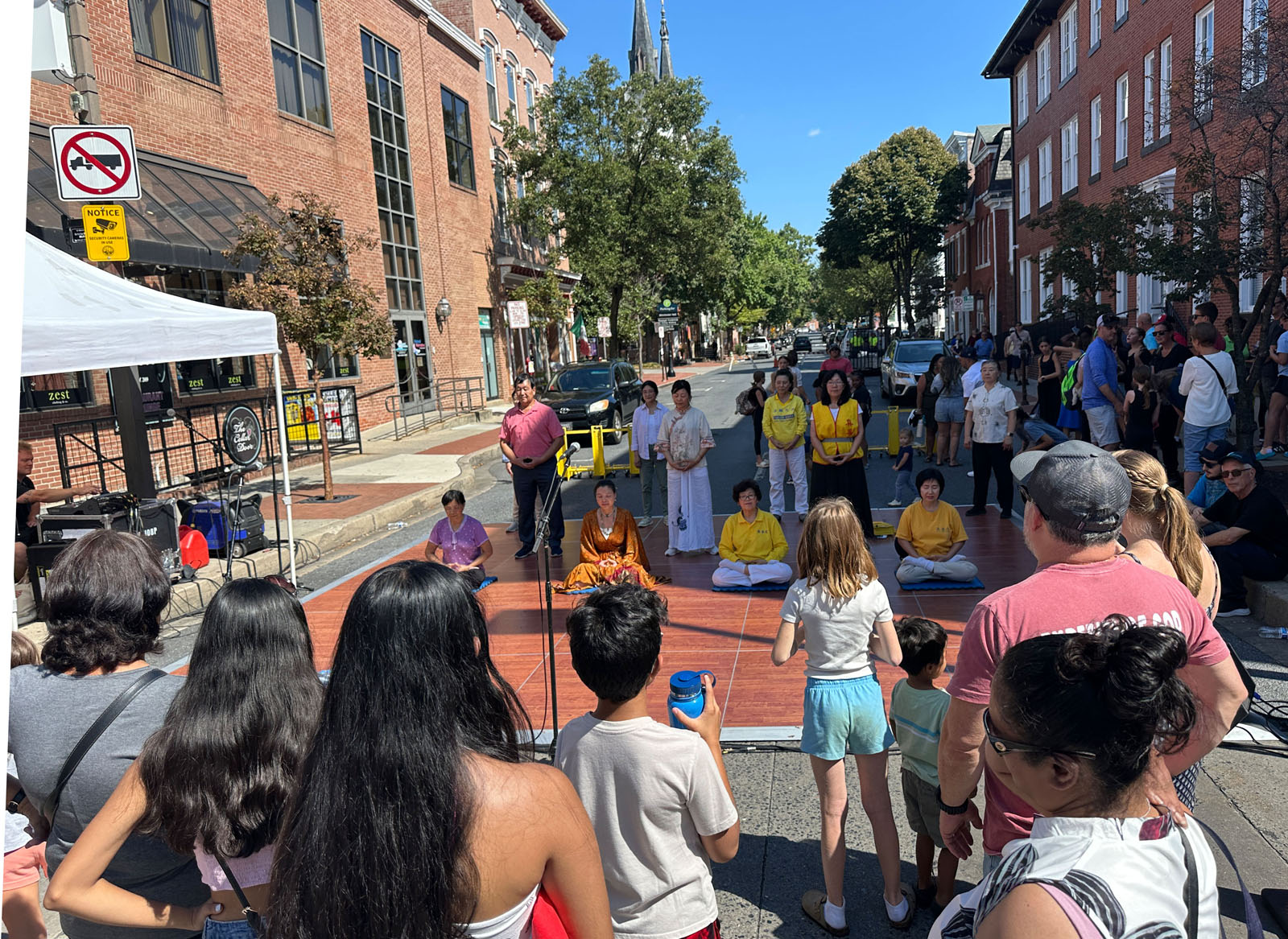 二零零五年九月十三日举办的“街头节庆”活动上,马里兰州的法轮功学员向民众介绍法轮大法,并让人们了解中共迫害法轮功的真相。有些人说,他们正在找寻可以缓解压力的打坐功法,他们想学炼法轮功。还有些人了解真相后,在呼吁制止中共迫害法轮功的征签表上签名。