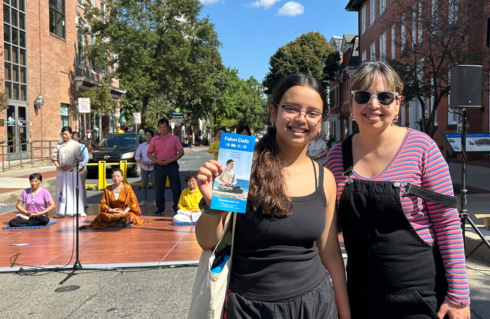 伊丽莎白(Elizebeth)和妈妈一起观看了法轮功学员的功法演示。她们还带走了一份介绍法轮大法的传单。伊丽莎白说:“我觉得这一功法看起来非常放松,非常平和。”她想尝试炼法轮大法功法。