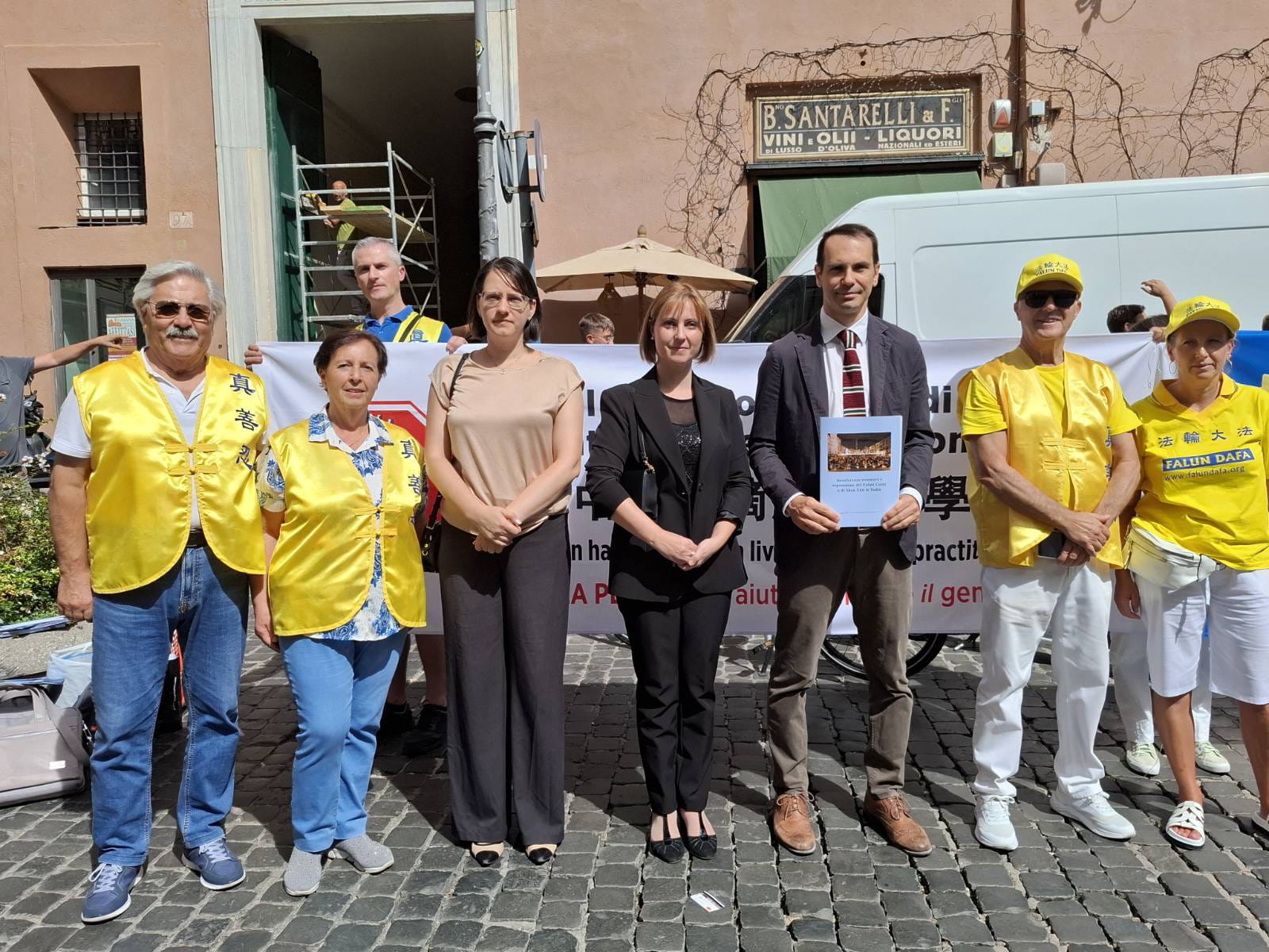 图3:二零二五年九月三日,罗马市议会副主席皮特兰杰罗·马萨罗(右三)参加了法轮功学员的和平抗议活动。