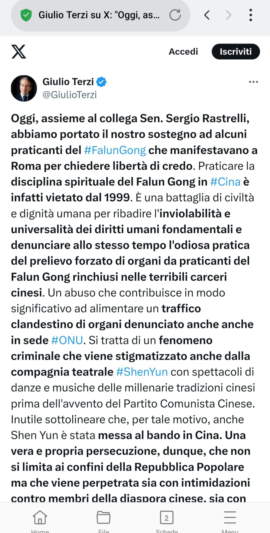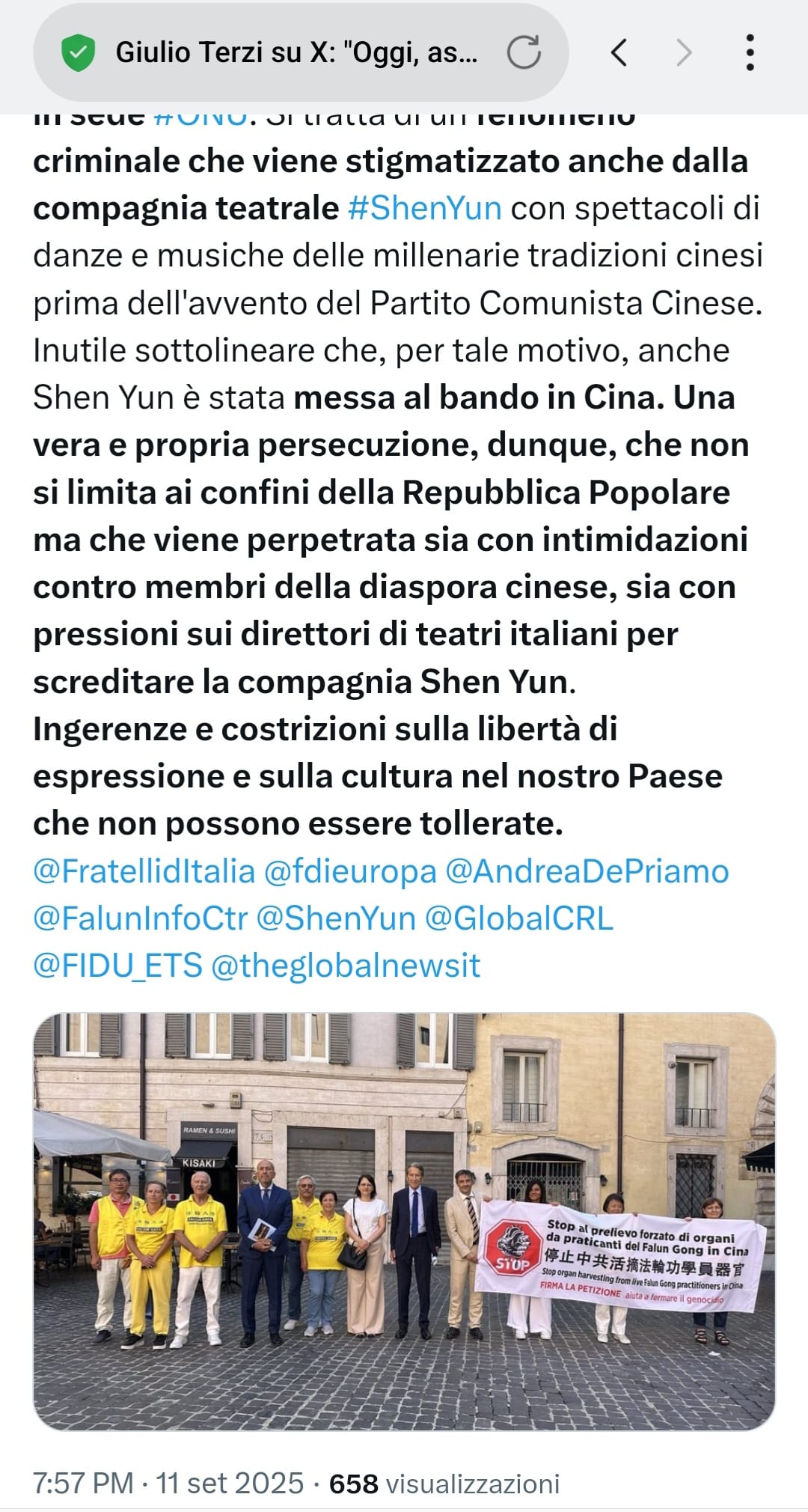九月十一日,前意大利外交部长,现为意大利兄弟党参议员的朱利奥·特尔齐(Giulio Terzi),当天在其社交媒体上写道:“今天,我与同僚塞尔焦·拉斯特雷利参议员一同前往罗马,向一些正在抗议的法轮功修炼者表达我们的支持。他们呼吁宗教信仰自由。