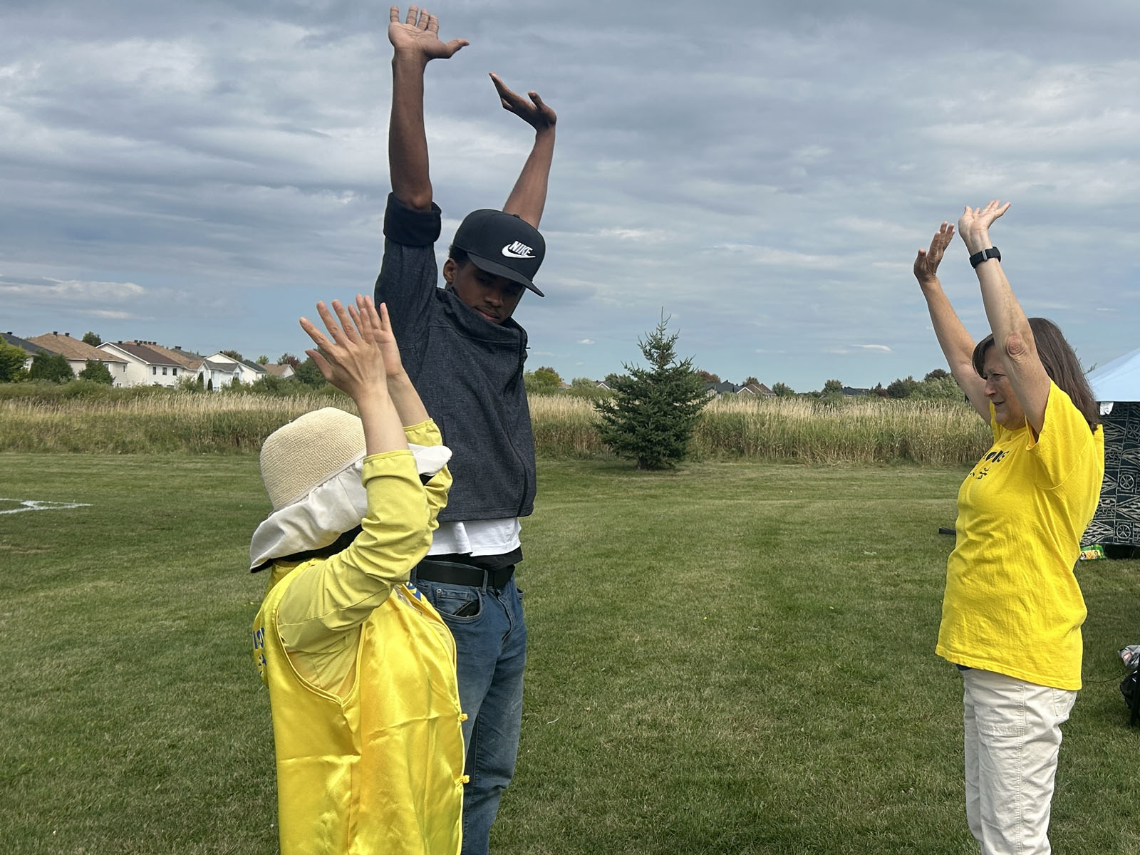 高中生塞巴斯蒂安(Jean Sebastien)现场学功后表示,学炼法轮功让他感受到能量流动与身心放松。他说:“我喜欢这种能量和身体的振动。”