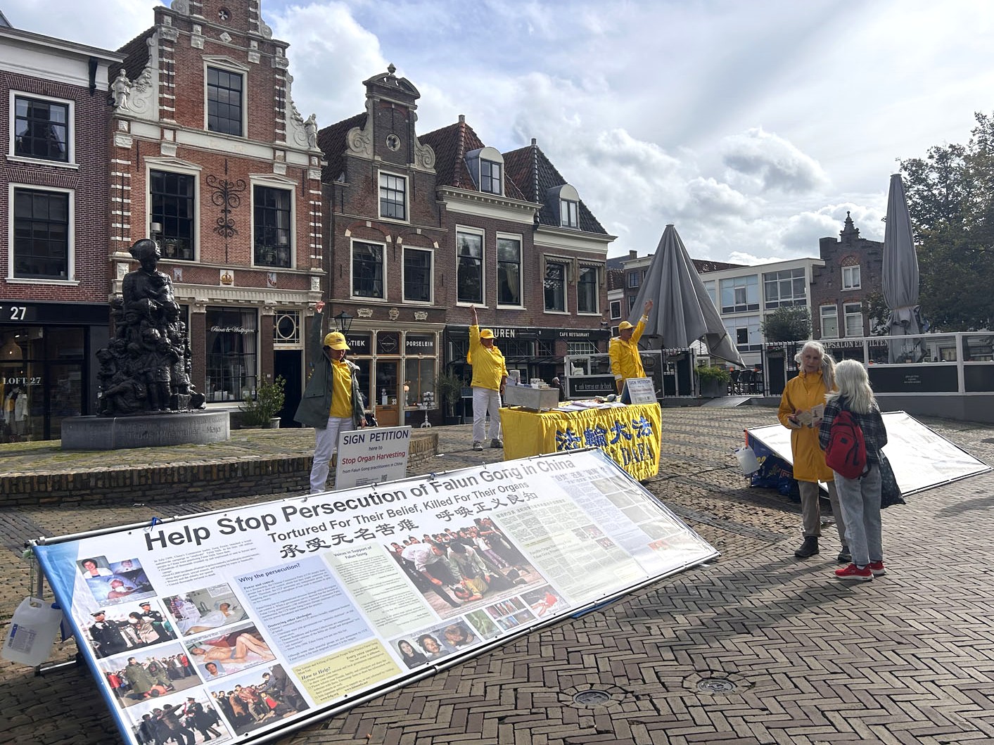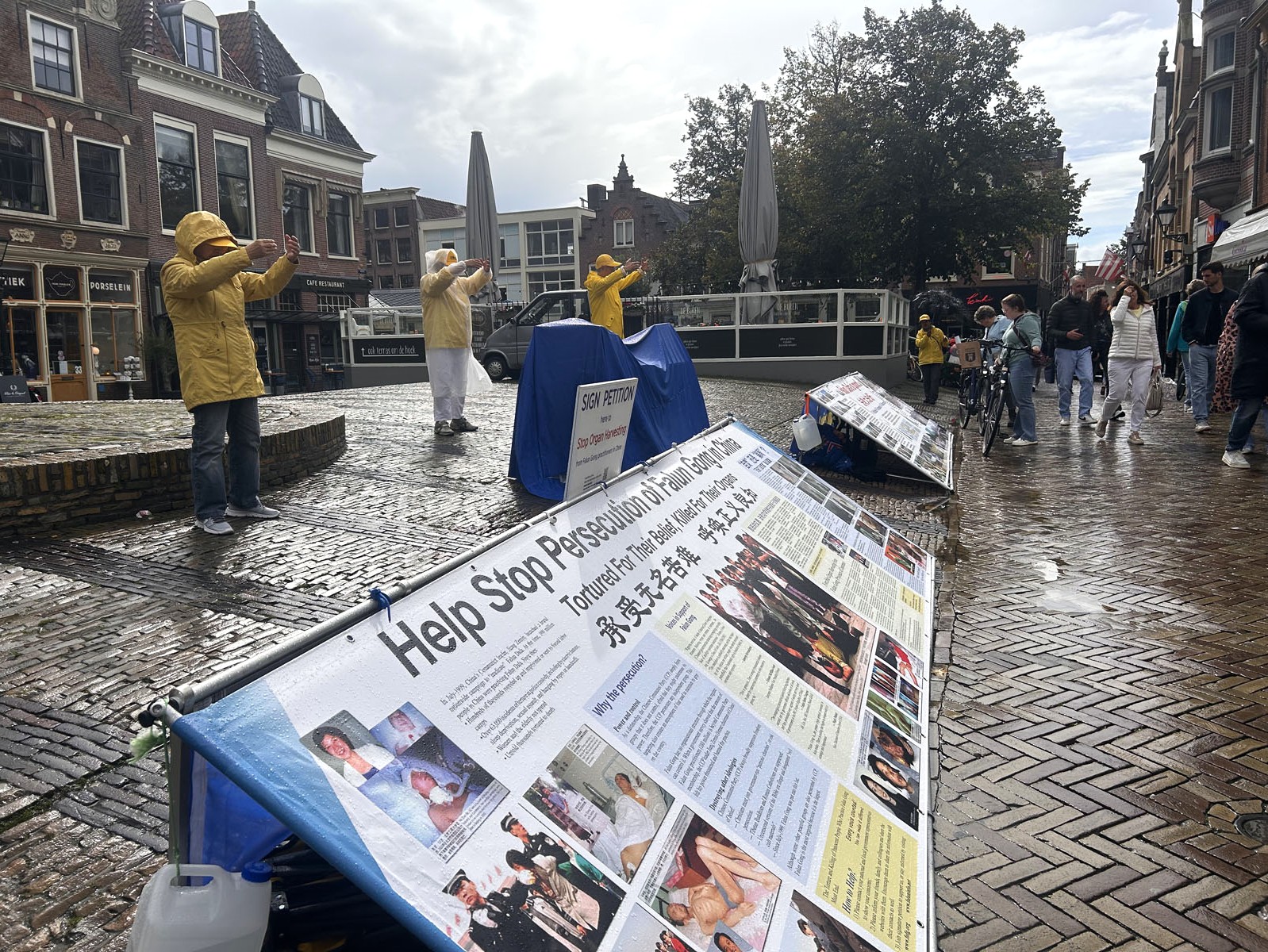 中午十二点,法轮功学员在阿尔克玛尔市拱形斯坦恩堡(Gewelfde Stenenburg)布置真相展板,与游客交谈及发放传单,征集反对中共迫害的签名。下午一点左右,天降急雨,雨势稍缓,法轮功学员穿着雨衣开始演示法轮功的功法,过路游客夸赞说:“你们(炼功的画面)真美,很安静,现在世界上到处是战争,这种安静正是世界需要的!”