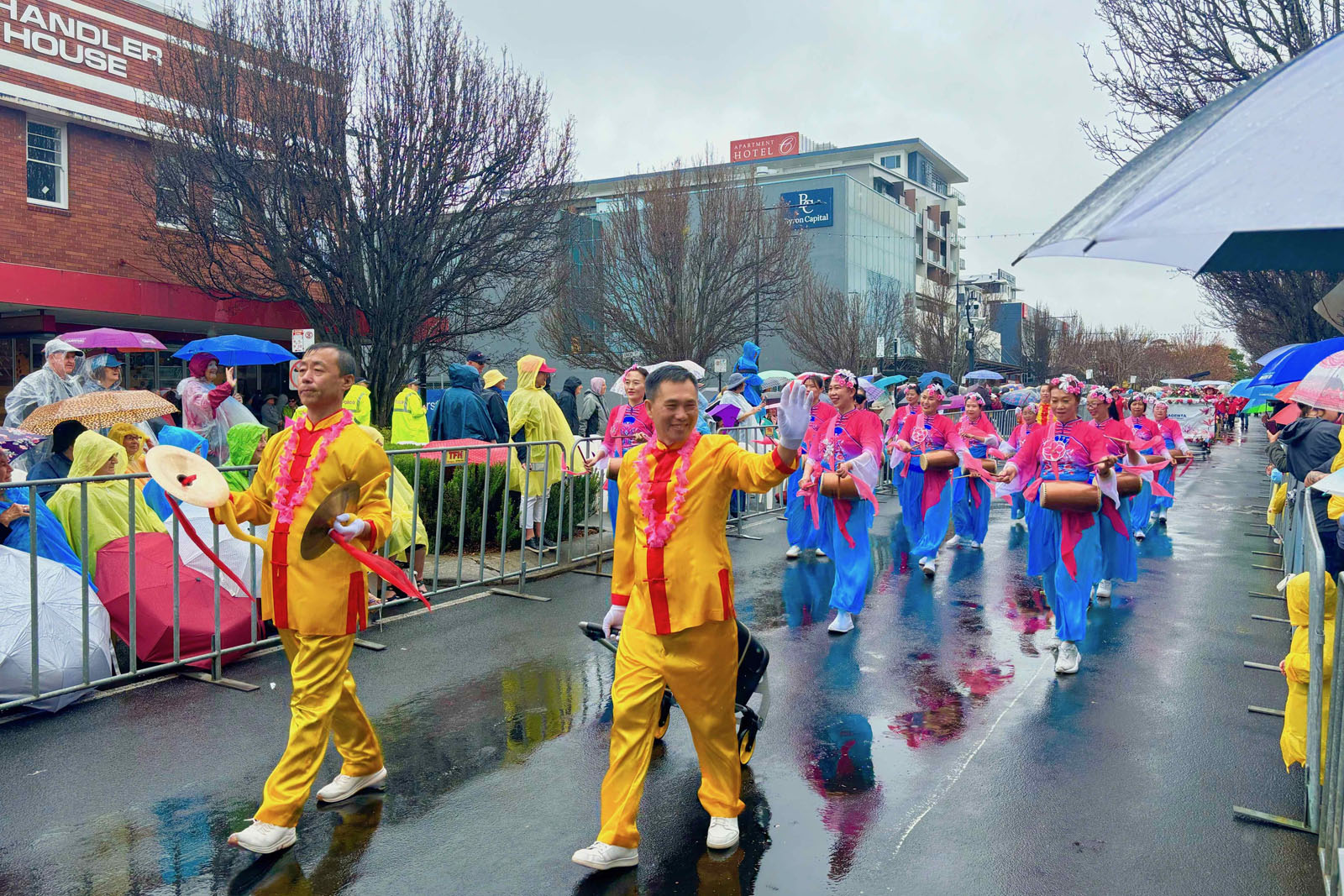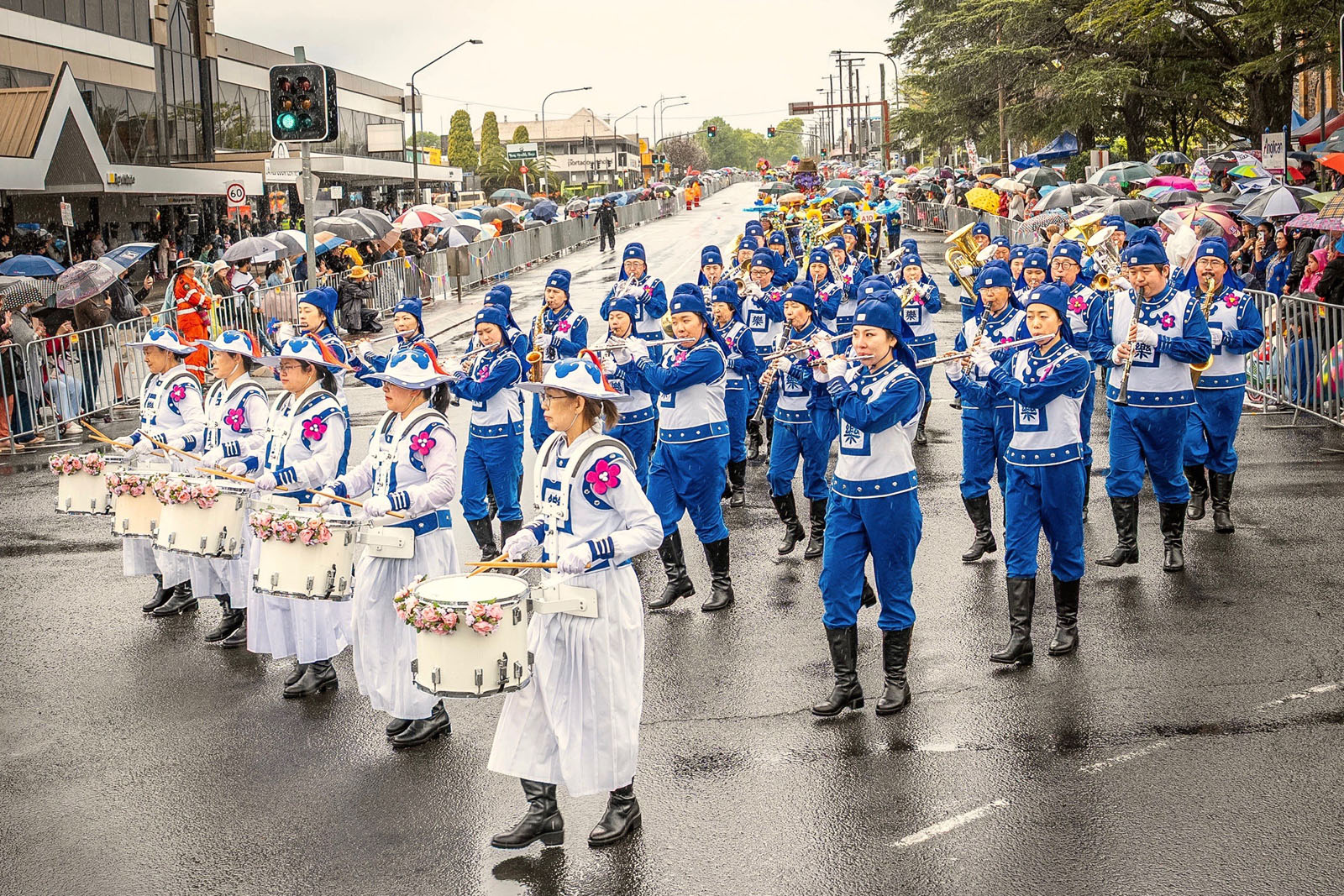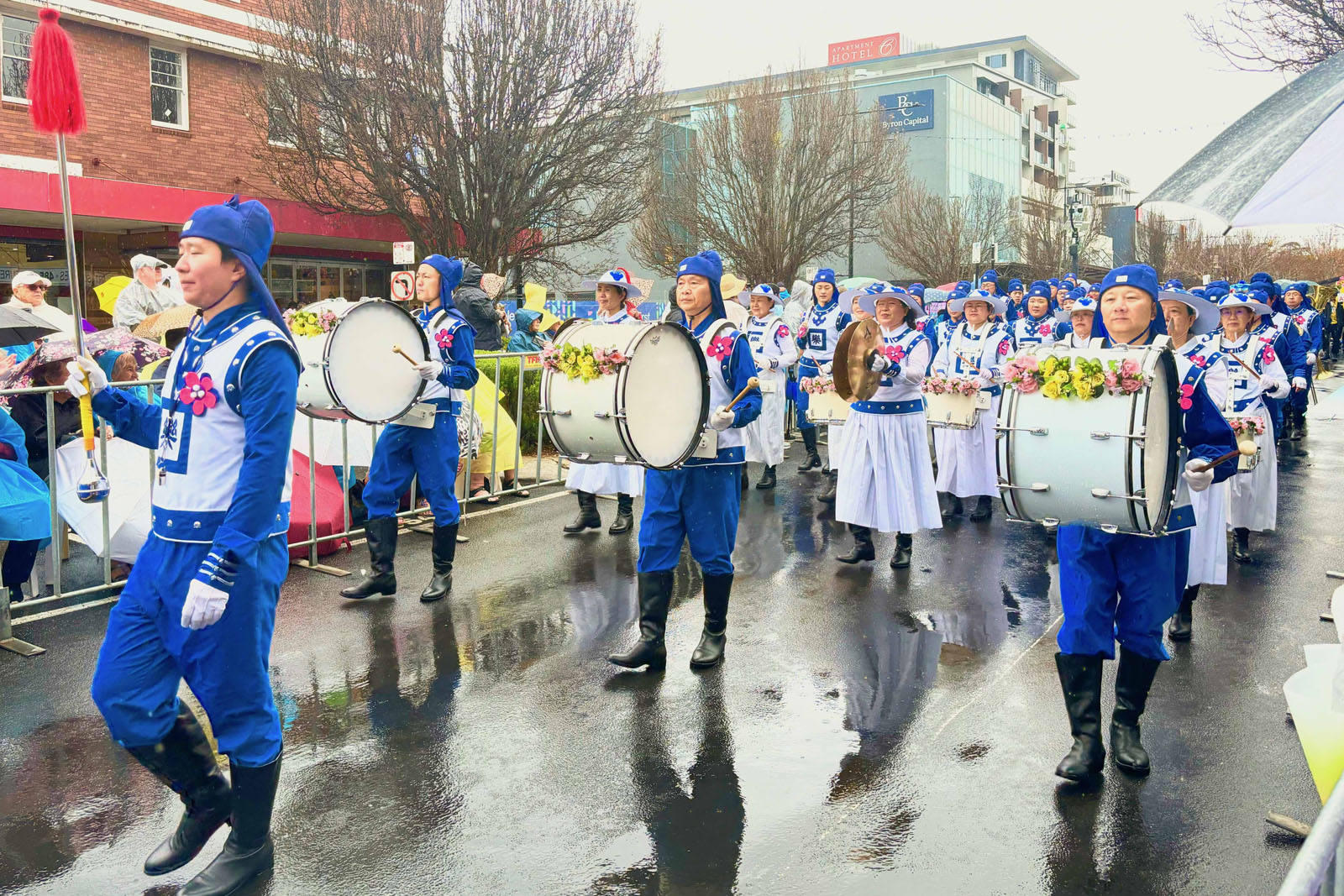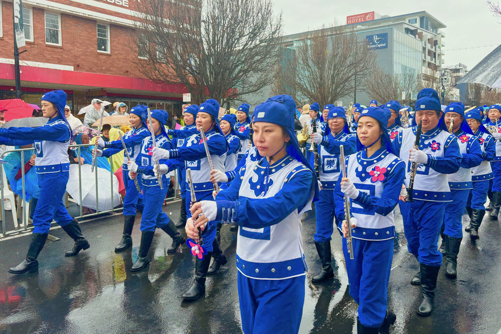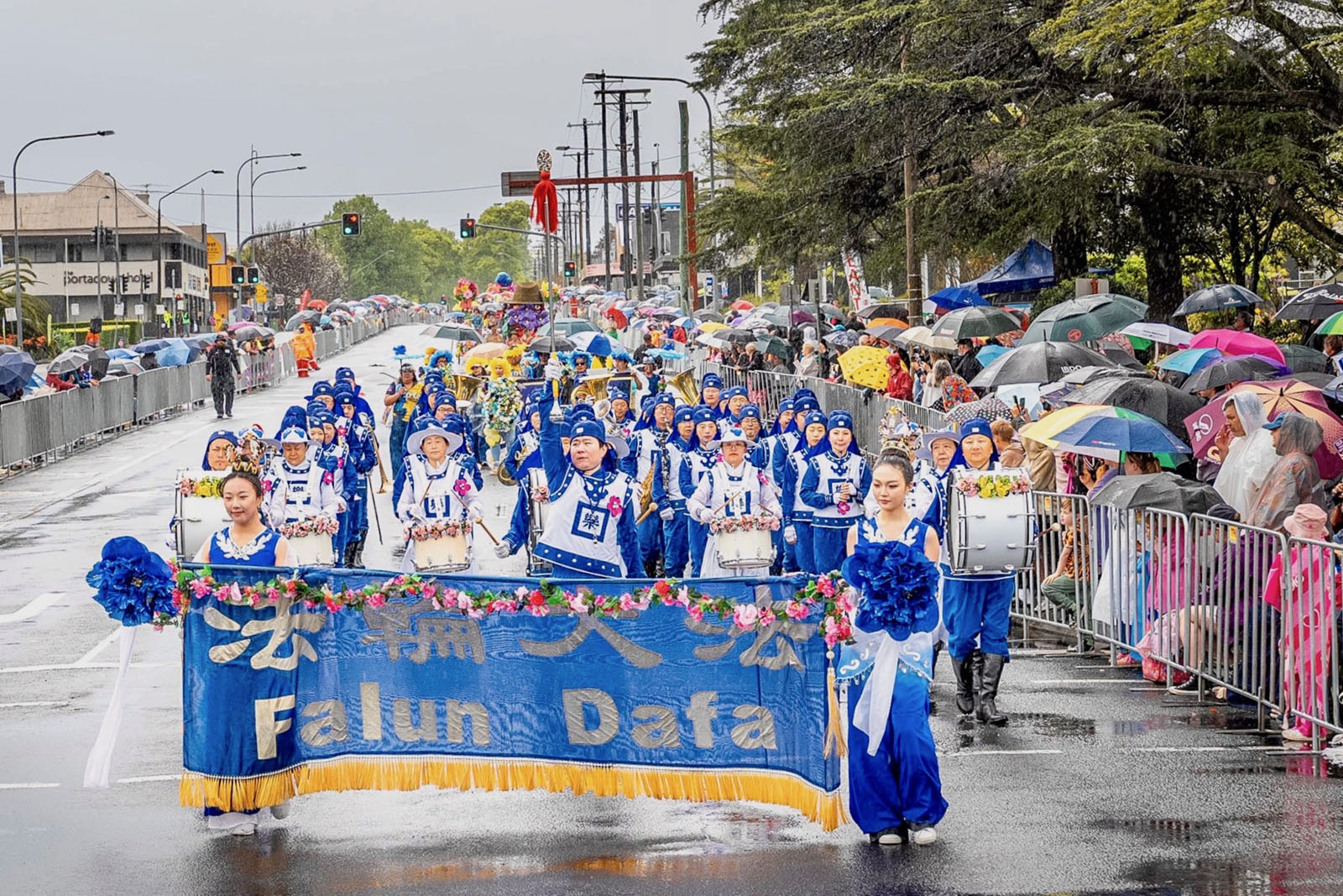 法轮功学员的方阵以超凡脱俗的光彩与祥和赢得了沿途数以万计民众的欢迎。沿途设有九个高音喇叭讲解台,昆士兰ABC新闻主持人珍妮·伍德沃德(Jenny Woodward)向观众介绍:“接下来我们将看到法轮功社区的表演,这是他们的天国乐团——一支由修炼法轮功的音乐家组成的铜管木管乐队。”