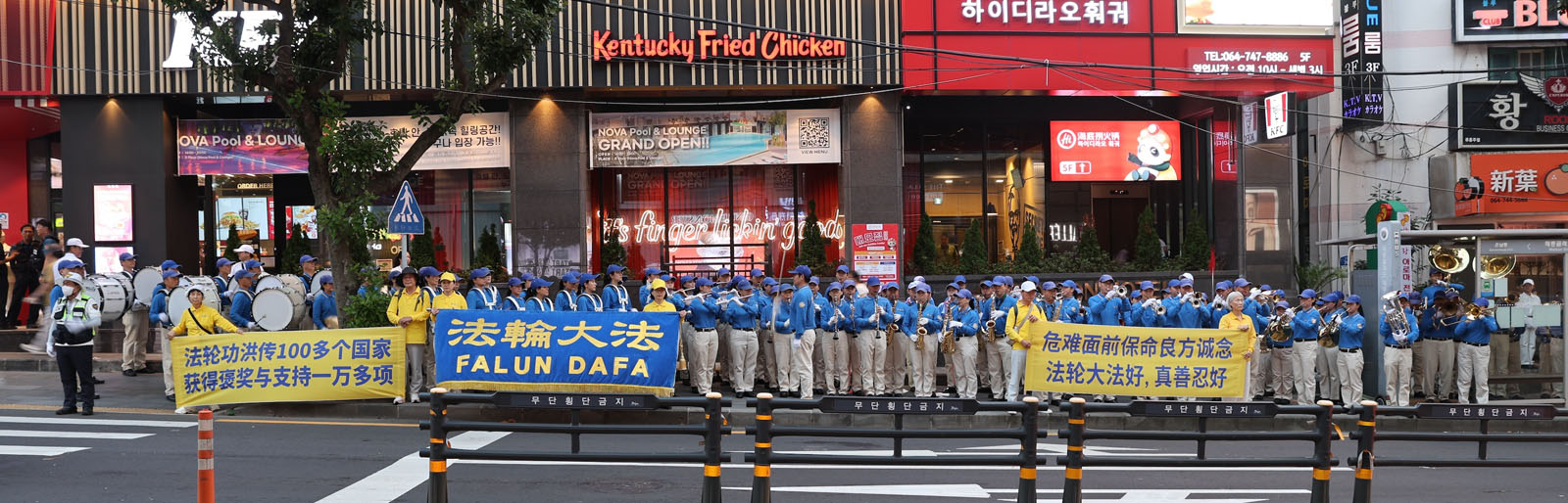 随后,天国乐团又到约五百米外的新罗免税店门口演奏。场面同样壮观,大批游客瞬间涌出正门,短短百米区域人山人海。因为进入新罗免税店必须经过正门,游客购物途中听到音乐纷纷出来,拿手机拍摄,或认真阅读展板。部份会中文的学员穿梭人群讲真相,不少中国游客当场办理“三退”。