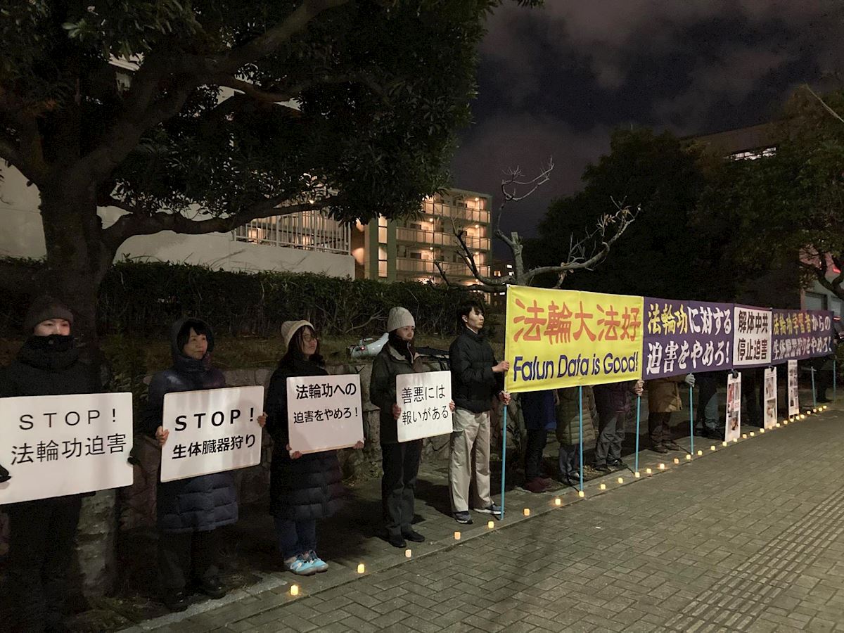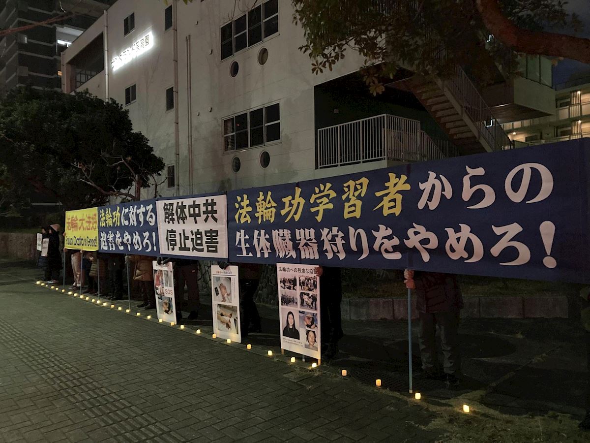 学员们整齐地展示多条中日文横幅与真相展板,上面写有“法轮大法好”“立即停止对法轮功的迫害”“立即停止对法轮功学员的活摘器官”“还法轮功自由”“STOP!对法轮功的迫害”“善恶必报”“STOP!活摘器官”等醒目标语,强烈谴责中共对法轮功迫害。
