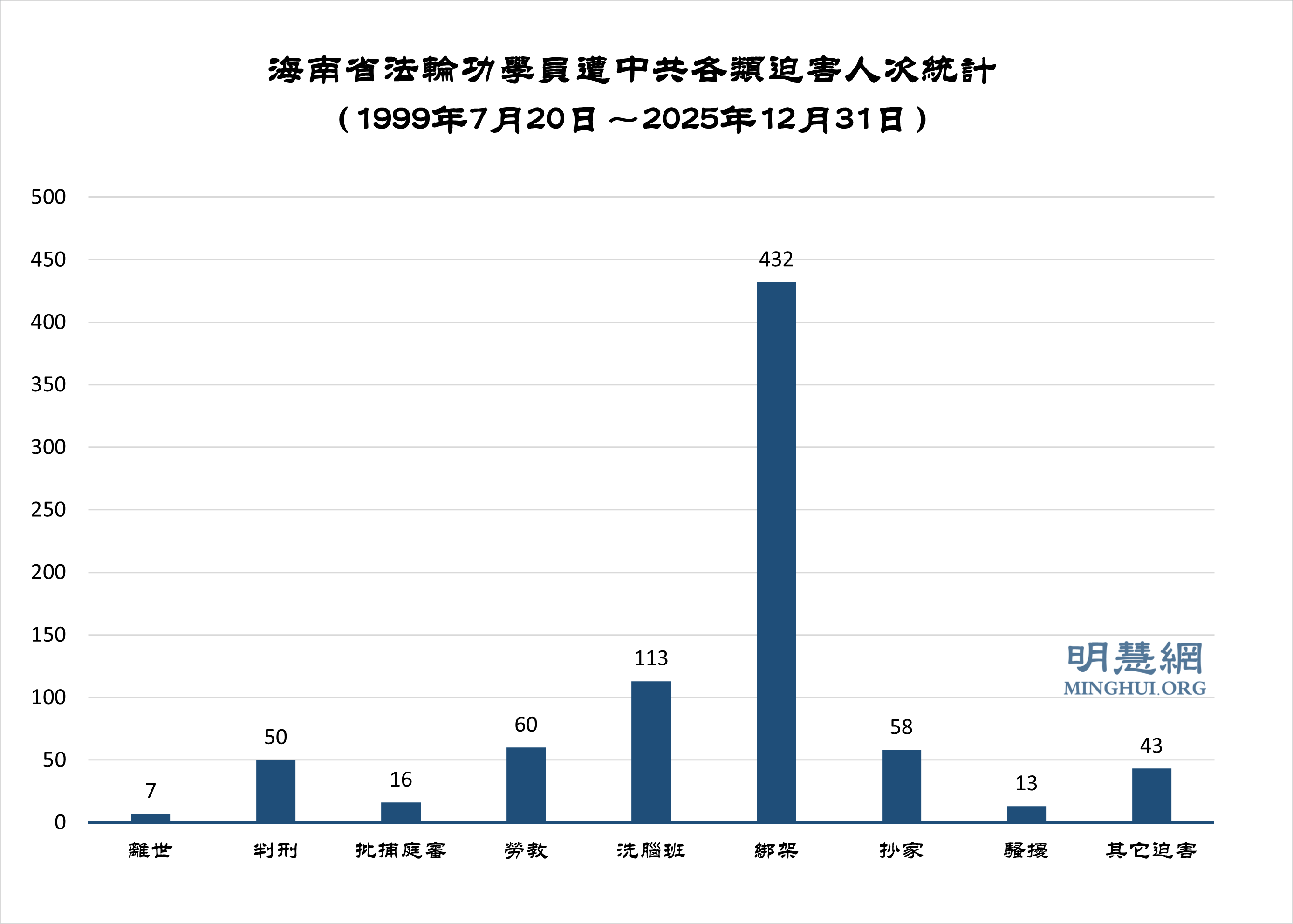 【明慧网二零二六年一月二十七日】(明慧网通讯员海南报道)据明慧网数据统计,一九九九年七月二十日至二零二五年十二月三十一日,海南省法轮功学员被中共恶党用各种手段迫害总计792人次。其中7人被迫害致死或含冤离世;50人次被非法判刑;16人次被非法批捕、起诉;60人次被非法劳教;113人次被洗脑班黑监狱迫害;432人次被绑架 (含绑架到看守所142人次、绑架到拘留所125人次、绑架到办案单位165人次);58人次遭抄家抢劫;13人次被骚扰;其它形式迫害43人次,勒索抢劫现金9.05万元。59名中共各类人员因迫害法轮功学员而遭恶报。