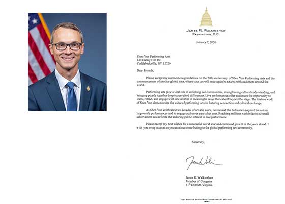 弗吉尼亚州联邦众议员詹姆斯·沃金肖致信祝贺神韵艺术团成立20周年,并赞扬其再度开启全球巡演,将神韵艺术之美呈现给世界各地观众。