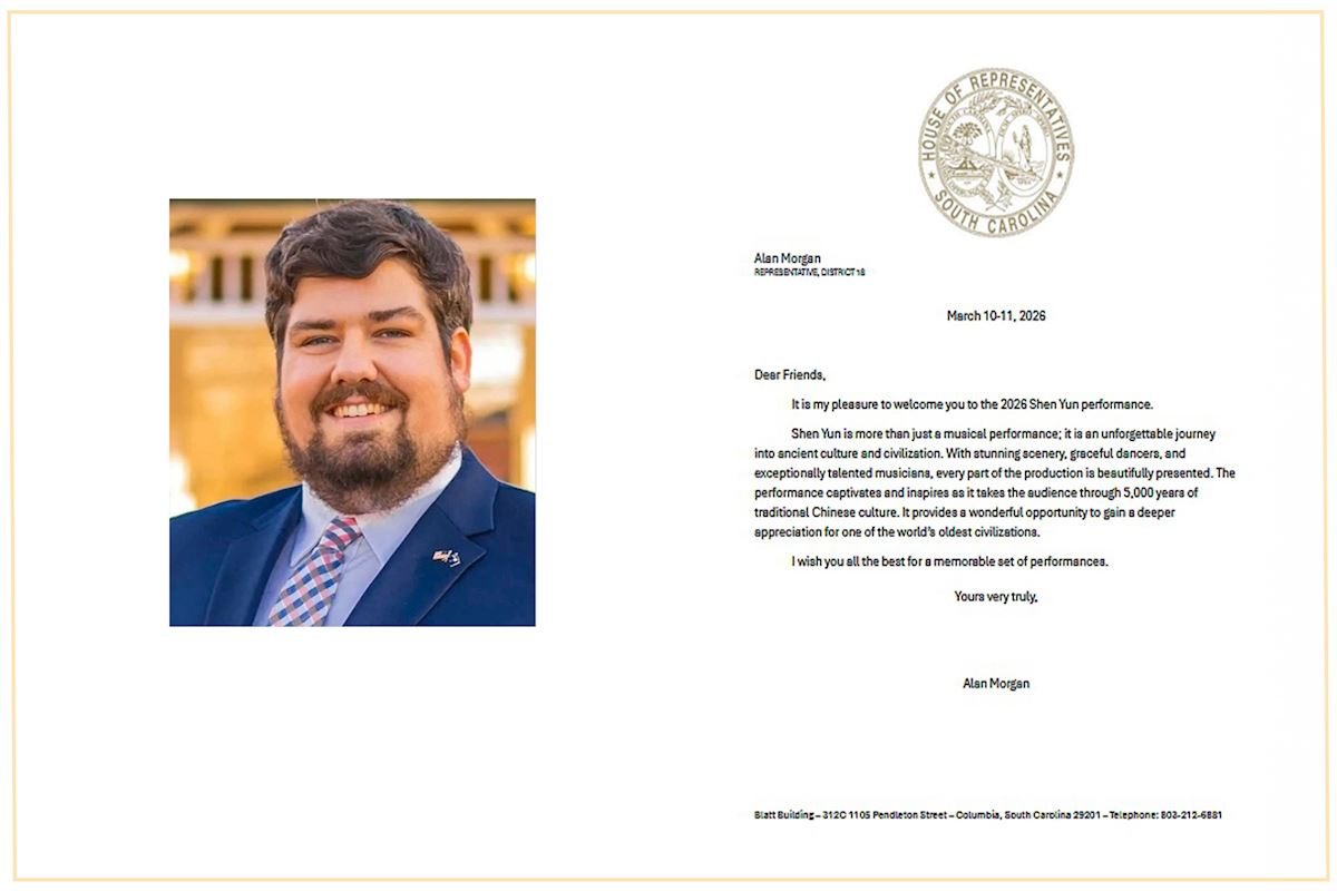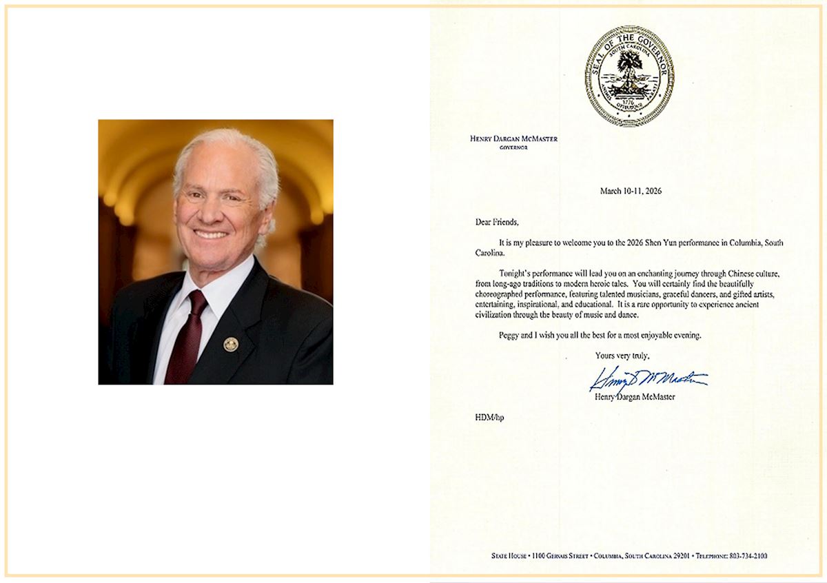 南卡罗来纳州州长麦克马斯特在贺信中表示:“我很荣幸欢迎民众莅临二零二六年神韵在南卡罗来纳州哥伦比亚市的演出。今晚的演出将引领您踏上一场穿越中华文化的迷人旅程,从悠远的传统到现代的英雄传说,皆涵盖其中。”