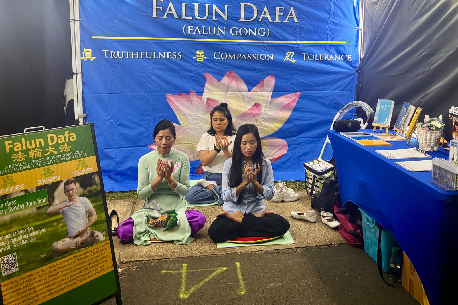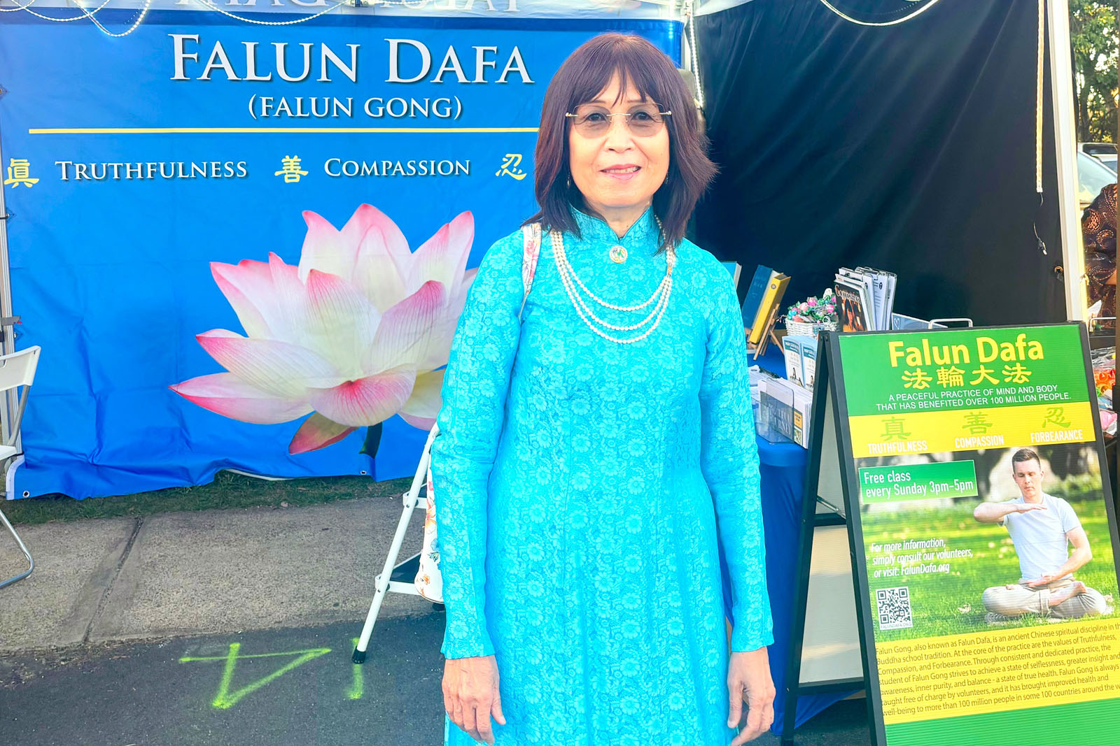 法轮功学员的展位坐落在人潮涌动、欢庆的传统节日庆典上,身着传统服饰的越裔法轮功学员向各族裔民众介绍法轮大法的美好,展示法轮功五套功法,并分享他们喜得大法的经历与感悟,修炼法轮功为他们带来了内心的宁静和健康的身体。不少民众来到展位了解真相,他们赞赏真、善、忍永远是好的,是社会基石。