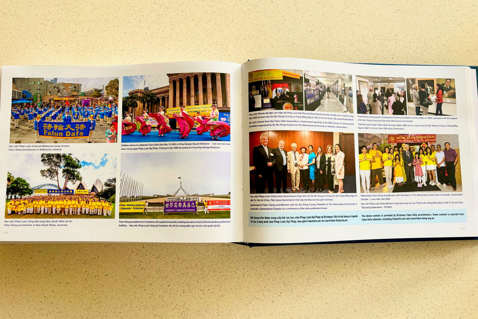 “越南社区50周年”书中还加入了不少法轮功的照片和信息,对此阮先生还表示:“加入这些信息,是表达我们越南社区对法轮功的支持。因为我们有相同的信念,经历过相同的事情。法轮功受到中共迫害,我们越南移民也曾经受到过共产主义的迫害,因此我们逃离越南,来到澳洲这片自由的土地。平稳、自由、尊重是澳洲的价值观,我们理所当然的应该支持法轮功。”