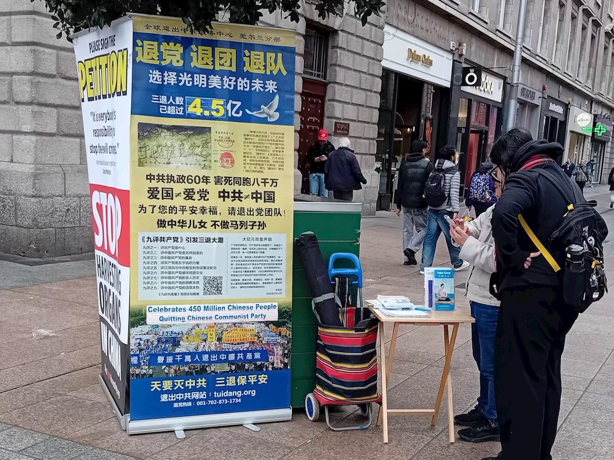 二零二六年三月的每个周末,法轮功学员在都柏林举办讲真相活动,传递真、善、忍的美好并揭露中共的残酷迫害。随着中国留学生和移民的增加,以及疫情后大陆游客的恢复,周一到周五,学员也会在此设立信息点,便于更多同胞获得未经过滤的真实信息。许多中国人在这里做了三退,也有明真相的中国人经过时,高喊“法轮大法好”表达支持。