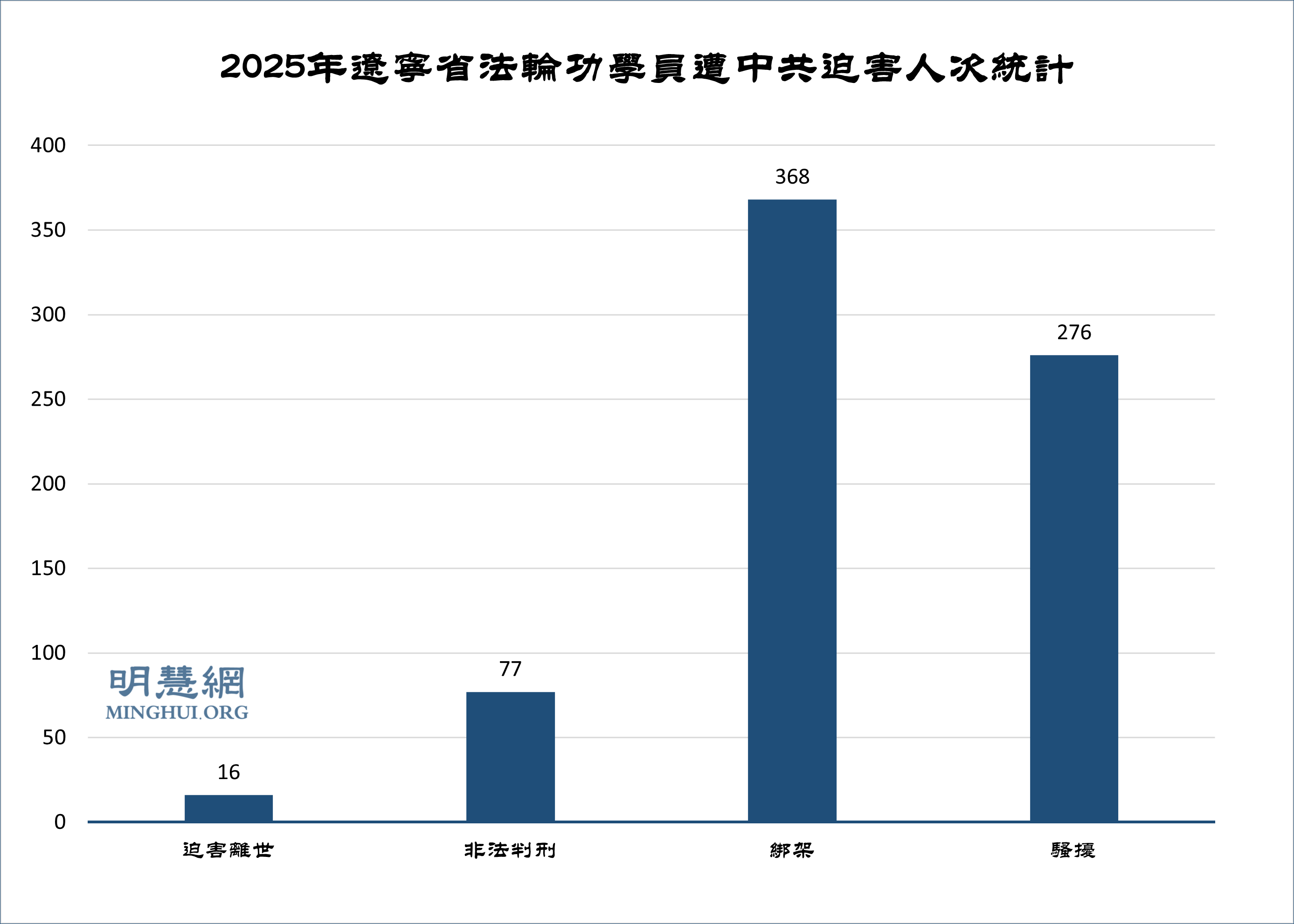根据明慧网报道统计,二零二五年获知辽宁省法轮功学员被迫害致死或含冤离世16人,被非法判刑至少77人……
