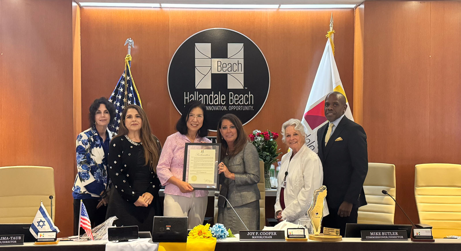 二零二六年三月四日晚上,美国佛罗里达州哈兰代尔海滩市(Hallandale Beach)市长乔伊·库珀(Joy F. Cooper)在市政厅的市议会会议厅,向法轮功学员代表颁发了对神韵艺术团的褒奖状,并宣布三月四日为“神韵表演艺术日”。