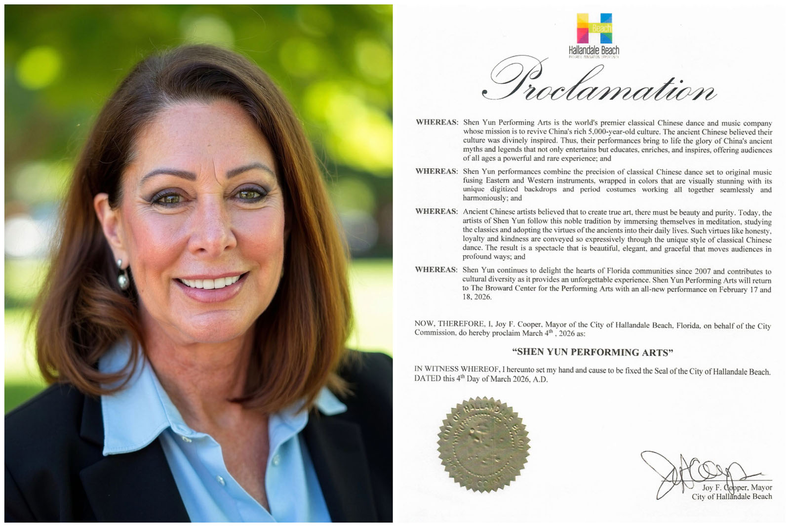 因此,我,佛罗里达州哈兰代尔海滩市市长乔伊·库珀(Joy F. Cooper),谨代表市政 委员会,特此在二零二六年三月四日宣布:“神韵艺术日”