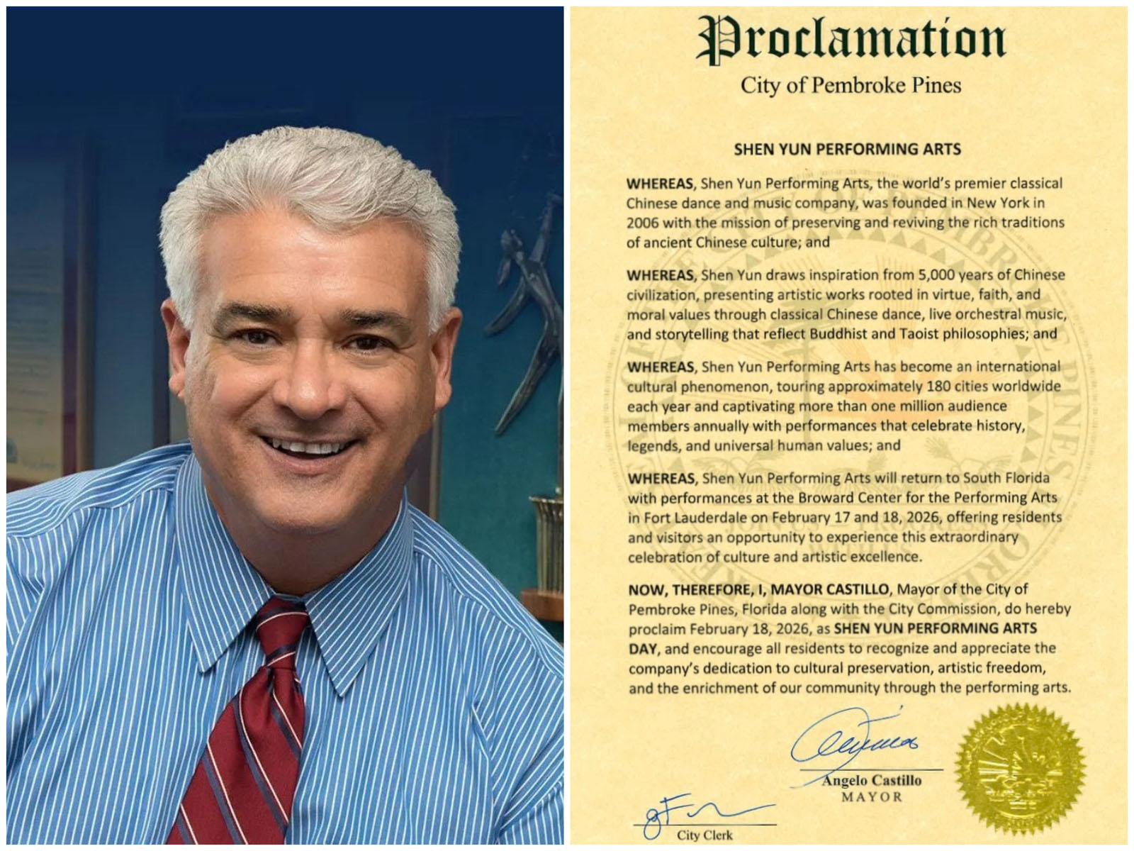 因此,现由佛罗里达州彭布罗克派恩斯市(Pembroke Pines)市长安杰洛·卡斯蒂略 (Angelo Castillo)偕同市委员会正式宣布,二零二六年二月十八日为“神韵艺术团日”,并鼓 励全体市民认可与赞赏神韵艺术团在弘扬传统文化、维护艺术自由及通过表演艺术丰富 社区文化生活方面所作出的贡献。