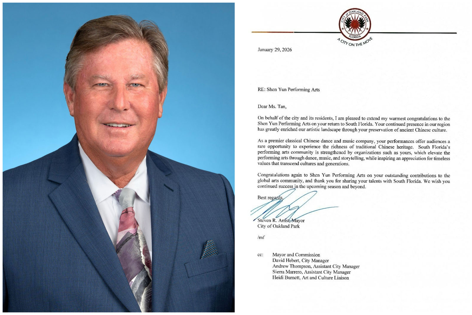 奥克兰帕克市(Oakland Park)市长史蒂文·阿恩斯特(Steven R. Arnst)也于一月二十九日向神韵南佛州演出主办方发来贺信,感谢神韵艺术团极大丰富了本地的艺术氛围 与文化内涵。