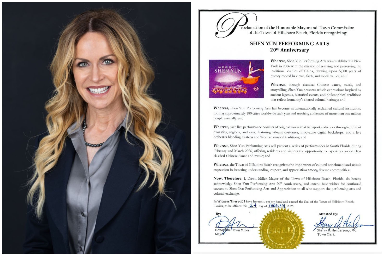 因此,本人——佛罗里达州希尔斯伯勒海滩镇市长道恩·米勒(Dawn Miller)——特此祝贺神韵艺术团成立二十周年,并向神韵艺术团致以诚挚祝贺,祝愿其不断取得成功,同时向所有支持表演艺术及文化交流的人士表示感谢。