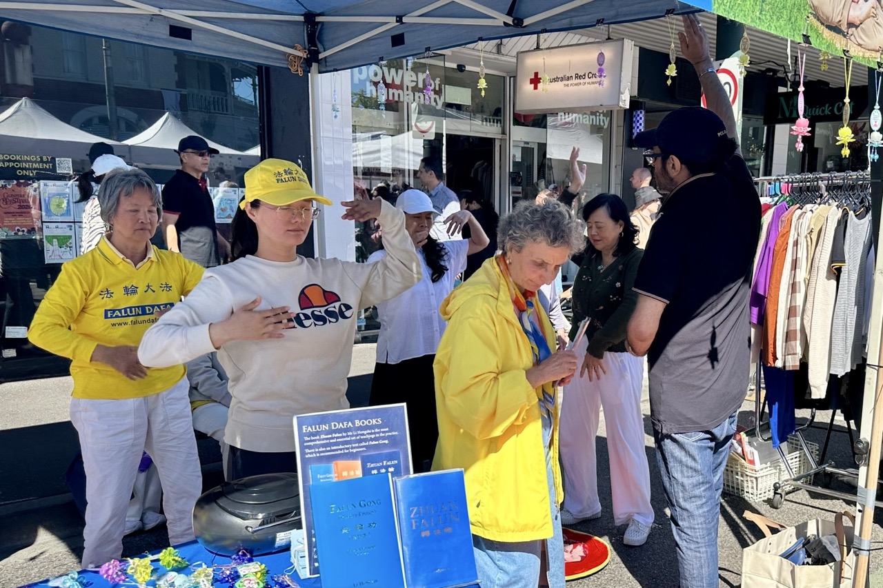 霍桑当地居民、律师尼克(Nick G)二十年前就听说法轮功,并通过阅读《大纪元时报》开始关注法轮功反迫害的讯息。当天,看到法轮功展位后,和学员进行了长时间交谈,并现场学炼功法。